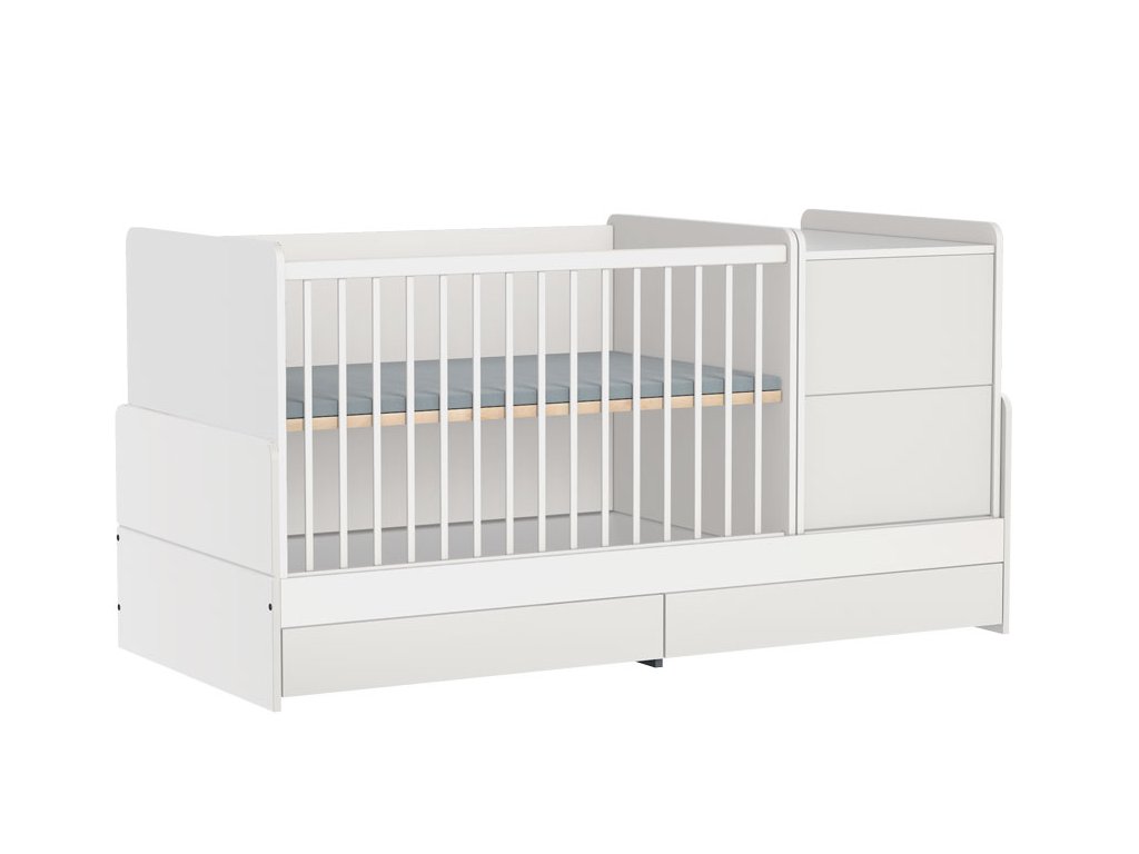 Luxusná trasformovateľná postieľka 5 v jednom. Vysoká kvalita použitých materiálov, lakovanie vo vysokom lesku aj najkvalitnejšie kovanie s tlakovým ovládaním a tlmením stanovuje nové meradlá priestorovo úsporného riešenia. Na 2 metroch máte celú detskú izbu. Na začiatku ju budete využívať v komplete a všetko máte poruke. Neskôr, keď dieťa povyrastie, z kompletu vytvoríte samostatnú postieľku a skrinku. V tretej fáze posteľ 180 × 80 cm a písací stôl. Nároky dieťaťa i Vaše sa časom menia. Táto kombi postieľka s nimi bude držať krok.