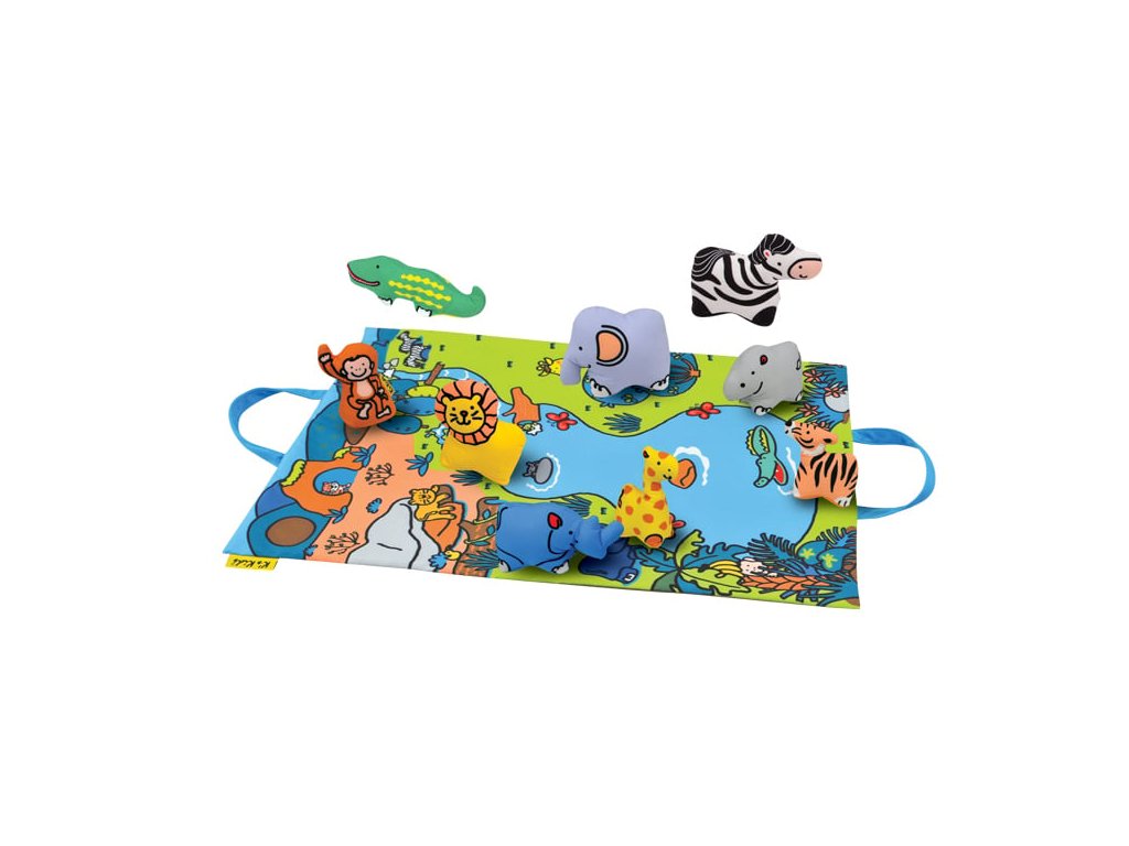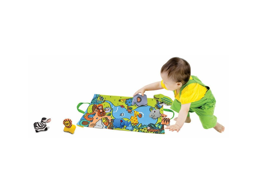 Prenosná edukačná podložka Džungľa s figúrkami zvieratiek ponúka bohatú kombináciu zábavy a učenia. S farebnou podložkou znázorňujúcou džungľu a 9 figúrkami známych divokých zvierat sa vaše dieťa naučí rozpoznávať zvieratá a priradiť ich k ich prirodzenému prostrediu. Podložka je ľahká, má rúčky na prenášanie a je umývateľná pri teplote 30°C.