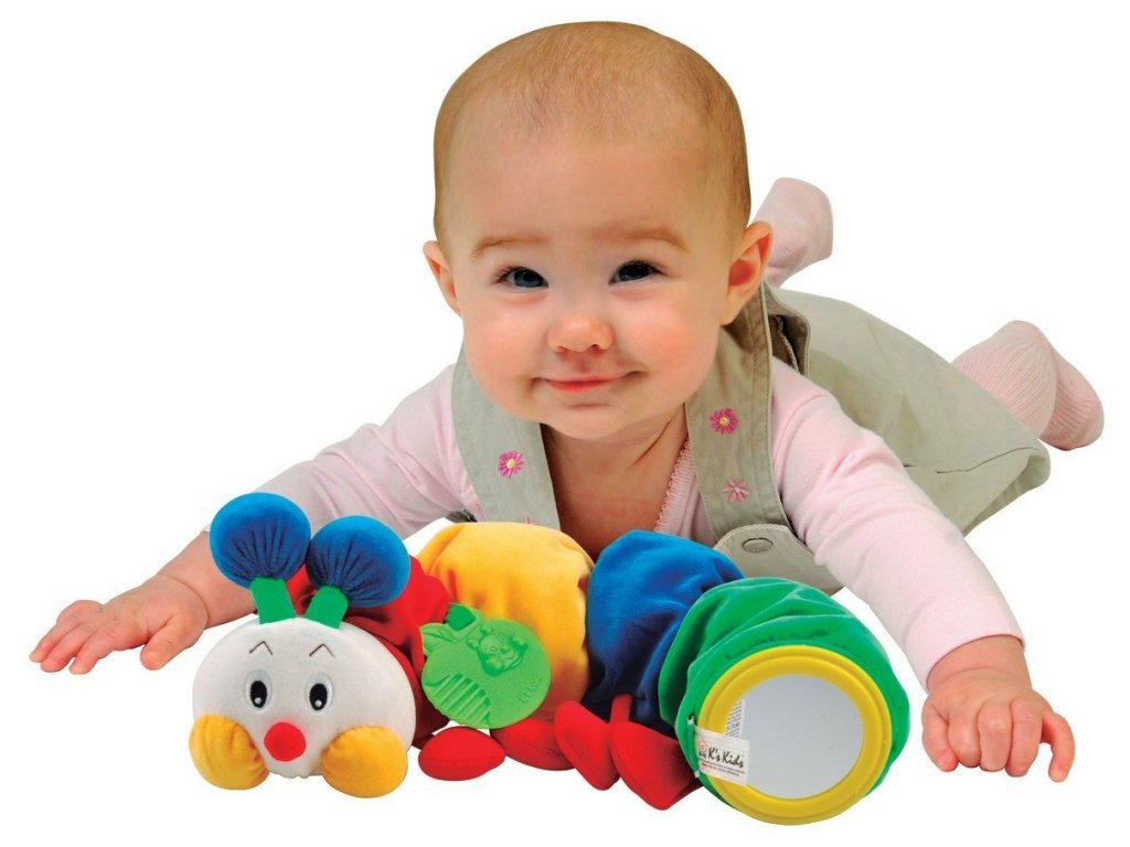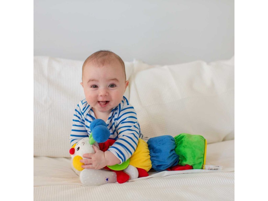 Plazenie za zvukom: Zatrasením húsenice motivujete dieťa, aby sa plazilo za zvukom, čím podporíte rozvoj hrubej motoriky.