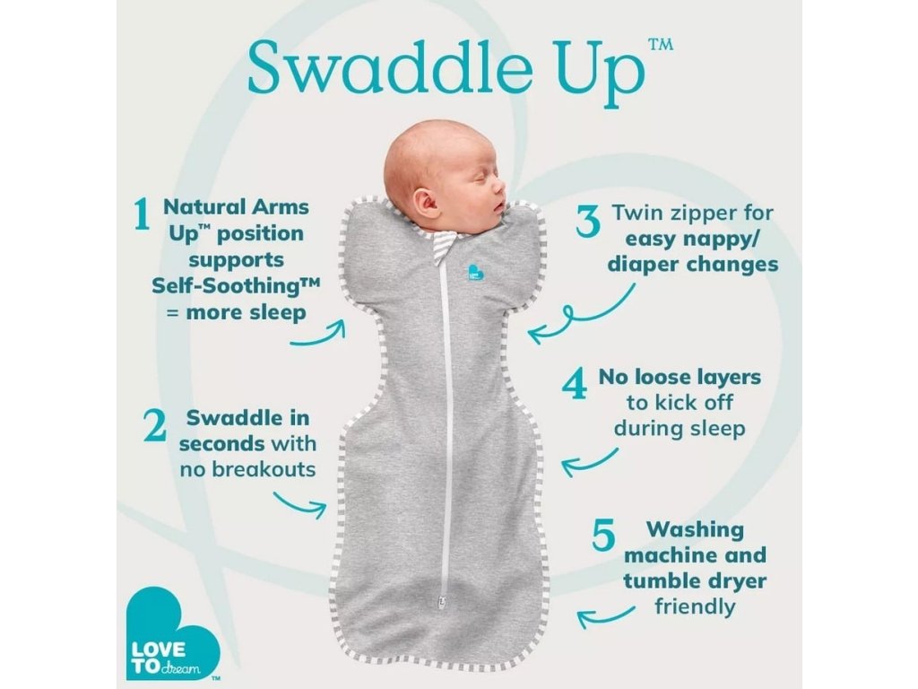 Love To Dream Swaddle UP je inovatívna zavinovačka pre dojčatá, ktorá je vyrobená s dôrazom na podporu prirodzenej polohy spánku vášho dieťaťa.