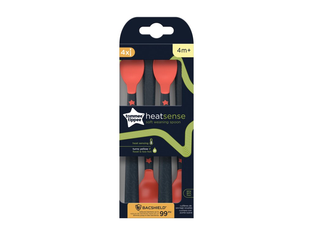 Lyžičky Tommee Tippee s tepelným senzorom zmenia farbu z červenej na žltú, ak je teplota jedla príliš vysoká.