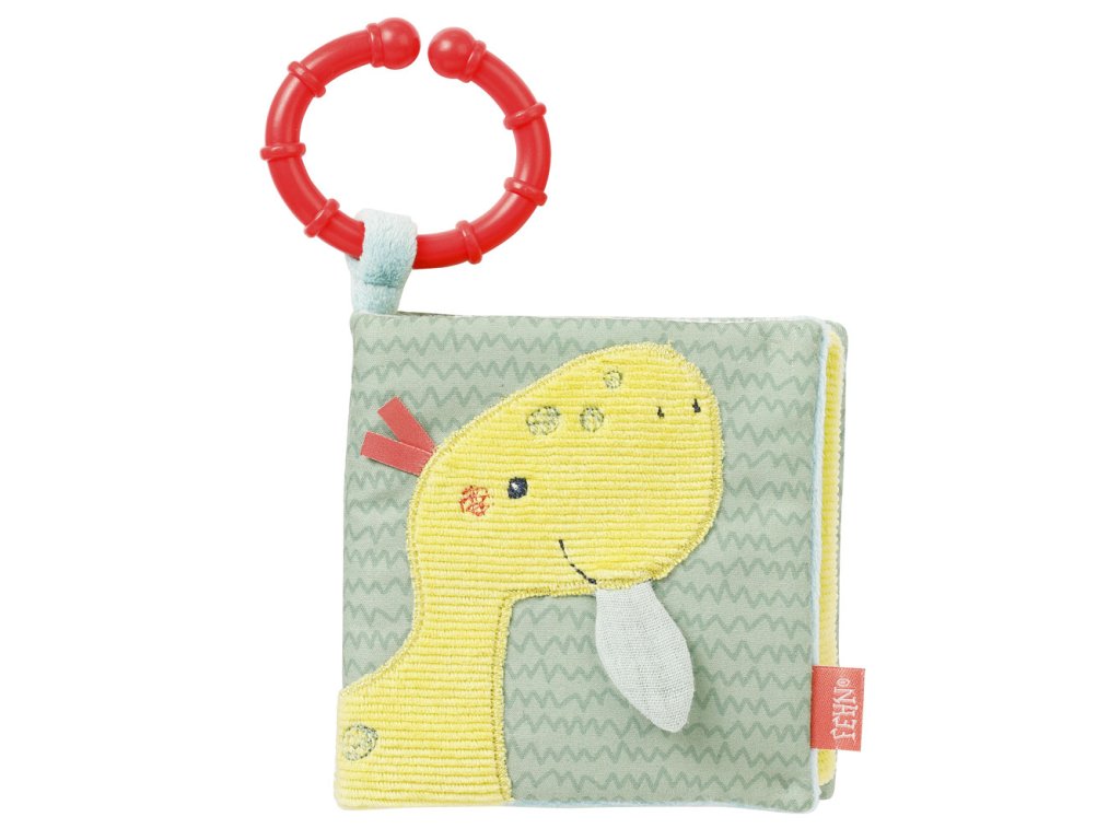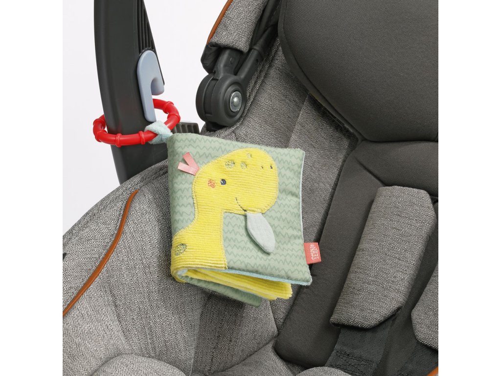 S látkovou plyšovou knižkou môžu deti na 8 stranách oživiť roztomilé praveké stvorenia. Každá stránka má rôzne zábavné efekty ako sú pískadlo , šuštiaci papier, plyšové vajíčka či zrkadlo . Knižka rozvíja úchop, hmat, fantáziu a jemnú motoriku . Praktický upevňovací krúžok dovoľuje ľahké pripevnenie na postieľku, kočíku alebo autosedačku.