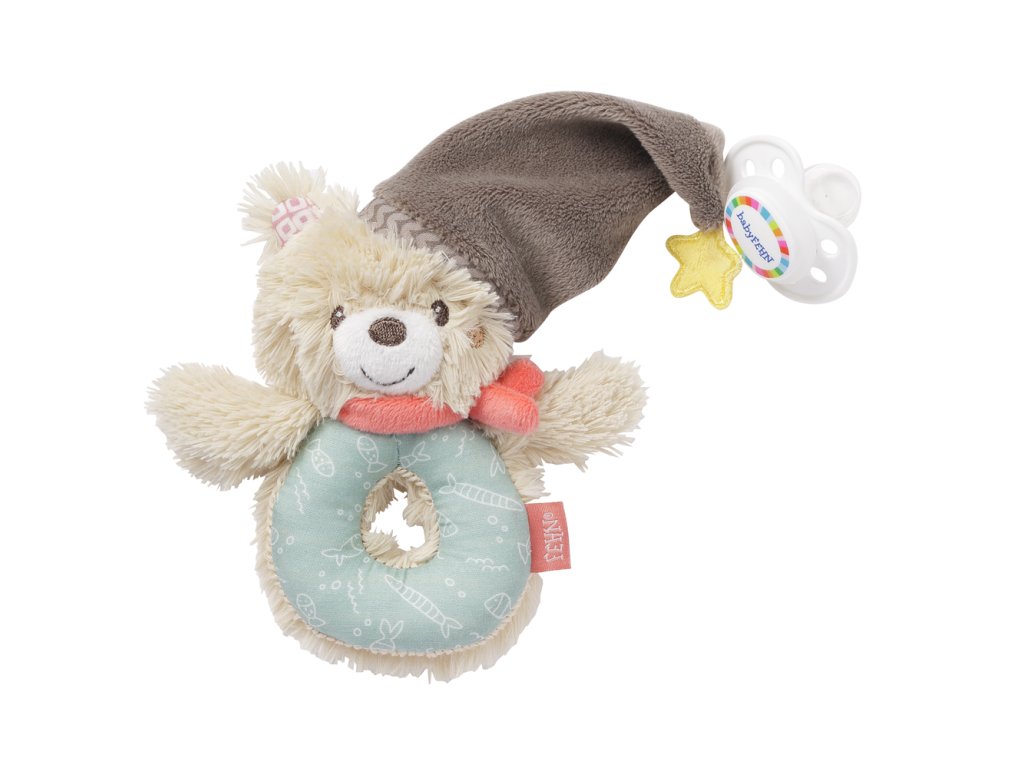 Medvedík s upevňovacím praktickým krúžkom zo silikónu, vhodný pre všetky cumlíky / cumlíky, nie sú súčasťou hračky. Príjemný materiál, šibalské prevedenie tváričky, hrkálka v krúžku a jednoduchý úchop robí z hračky obľúbeného kamaráta.