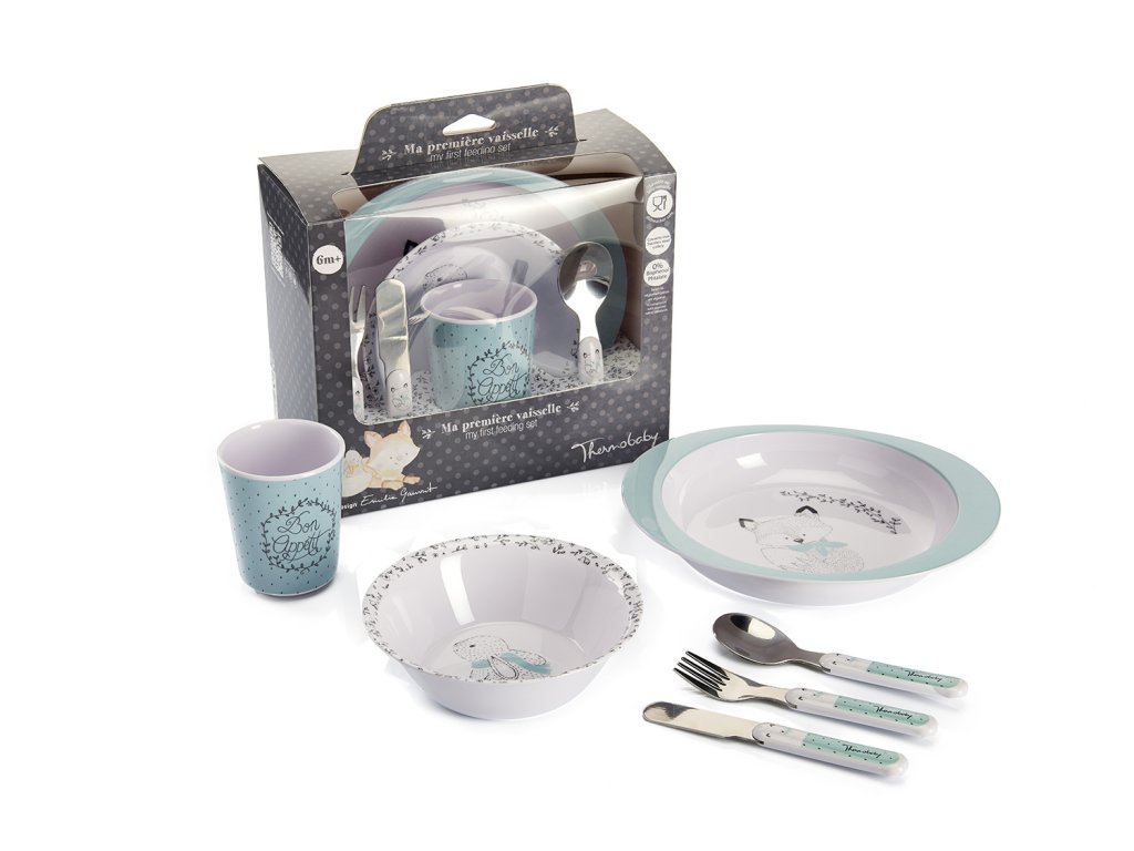 Thermobaby prvá jedálenská súprava je ideálna na jedlo pre deti. Sada obsahuje: tanier, misku, pohárik, vidličku, lyžicu a zaoblený nôž. Deti budú milovať zábavné a módne kresby zvieratiek. Nechajte vaše dieťa jesť ako dospelé. Pre zjednodušenie údržby možné všetky časti setu umývať v umývačke.