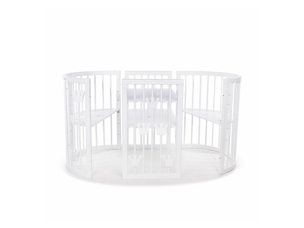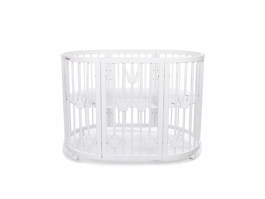 3 - oválna postieľka 77 x 125 cm (vnútorné rozmery 72 x 120 cm), výška postieľky bez koliesok 80 cm, na kolieskach / na hojdacích lištách 84 cm