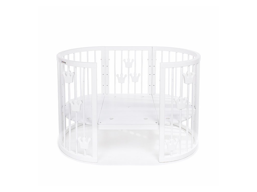 1 - okrúhla postieľka / kolíska 77 x 77 cm (vnútorné rozmery 72 x 72 cm), výška postieľky bez koliesok 80 cm, na kolieskach / na hojdacích lištách 84 cm