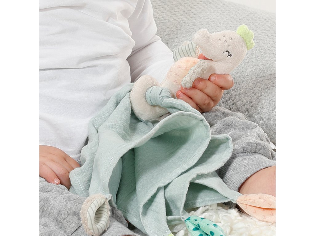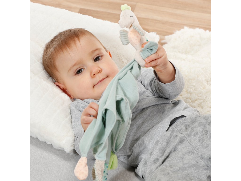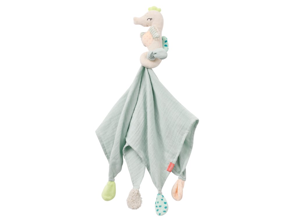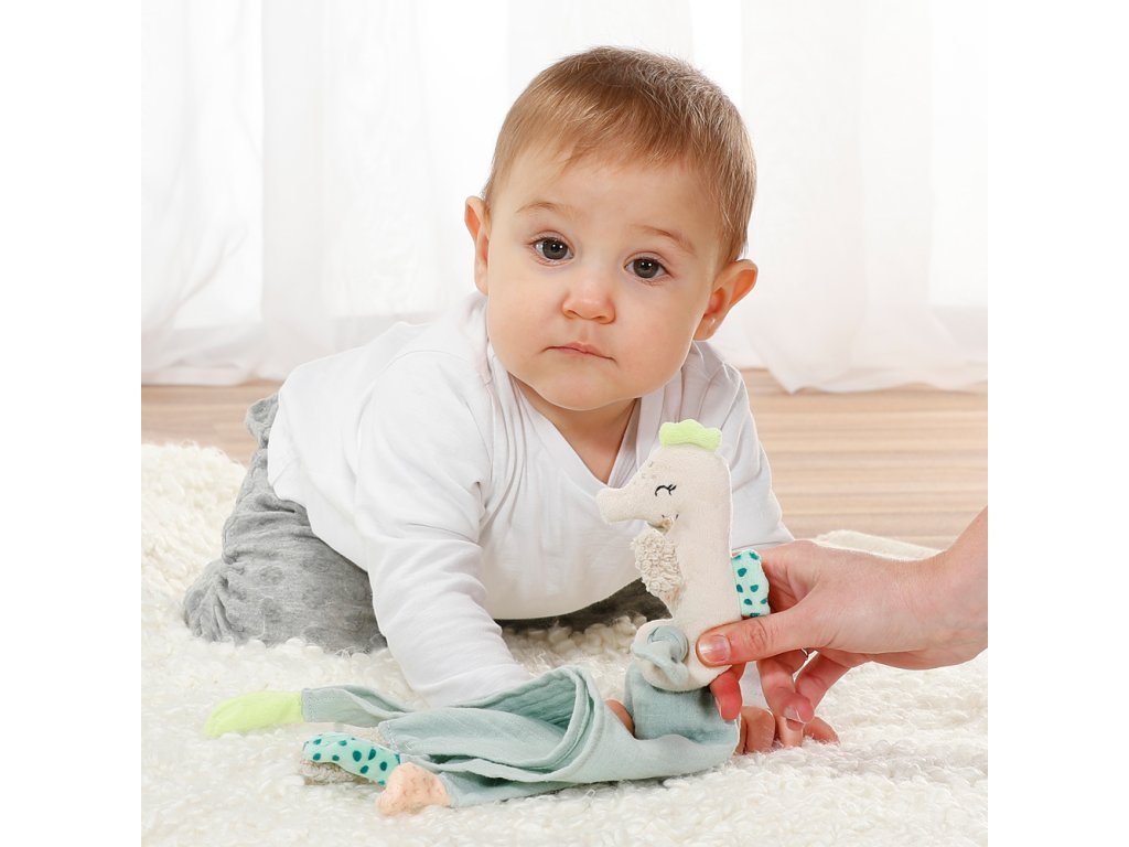 Bavlnená mušelínová tkanina poskytuje pocit bezpečia pri zaspávaní. Príjemne mäkké materiály, malé morské živočíchy a uzlíky na koncoch nabádajú dieťa, aby si precvičilo úchop.