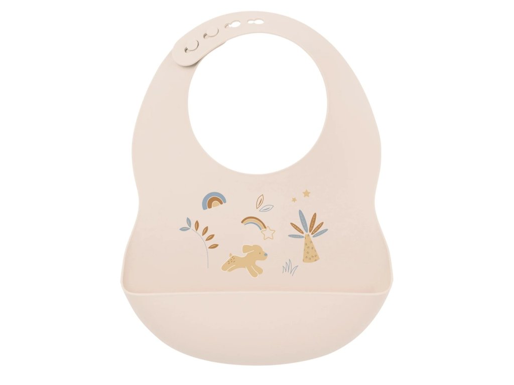 Podbradník Nattou vyrobený z pružného silikónu s motívom psíka a praktickou zbernou časťou zabezpečí kŕmenie a jedenie vášho dieťatka bez zbytočného stresu z neporiadku .