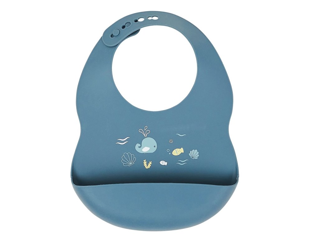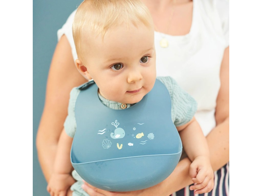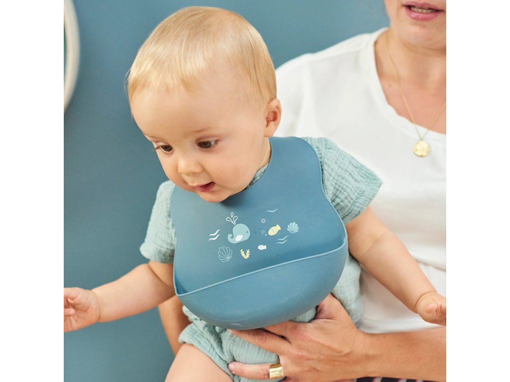 Podbradník Nattou vyrobený z pružného silikónu s motívom oceánu a praktickou zbernou časťou zabezpečí kŕmenie a jedenie vášho dieťatka bez zbytočného stresu z neporiadku .