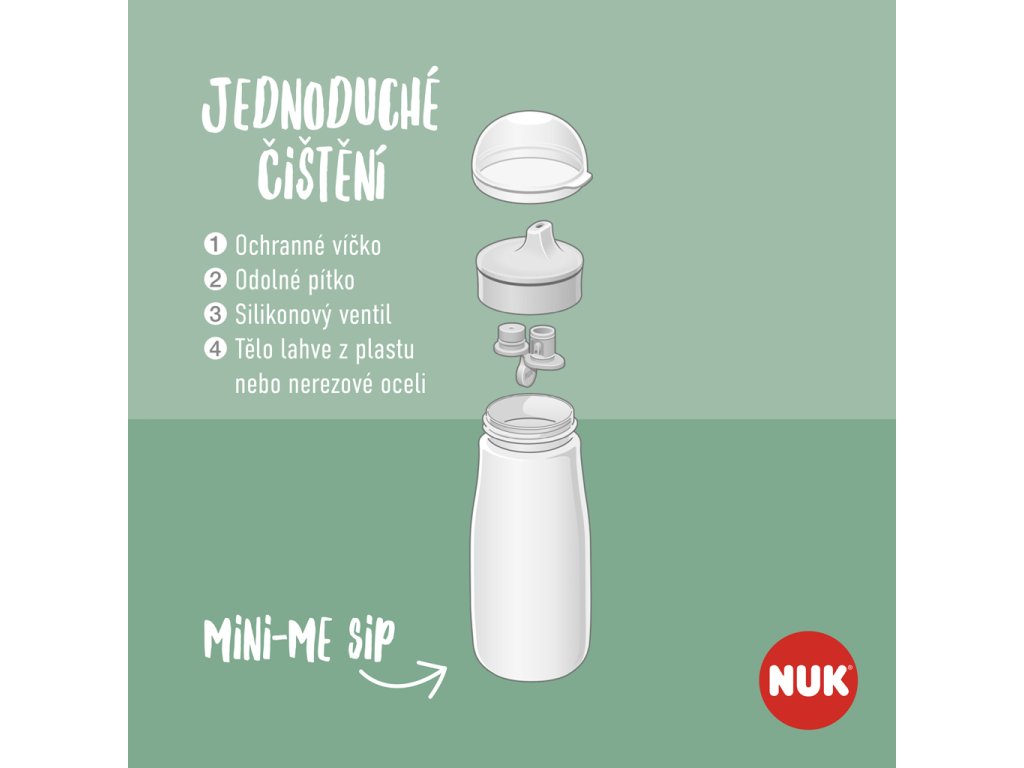 NUK Mini-Me je systém, ktorý rastie spolu s vaším dieťaťom. Vyberte si medzi nerezovou oceľou a nerozbitným plastom. Vyberte si z rôznych veľkostí. Vyberte si z pevného alebo vyklápacieho pítka. A môžete si zostaviť presne takú fľašu, akú potrebujete pre svoje dieťa. Nech už si vyberiete akýkoľvek model, fľaša netečie a je veľmi odolná. Stvorená pre prvé dobrodružstvá a všetko, čo príde po nich.