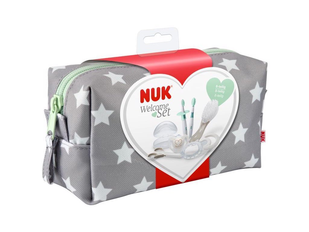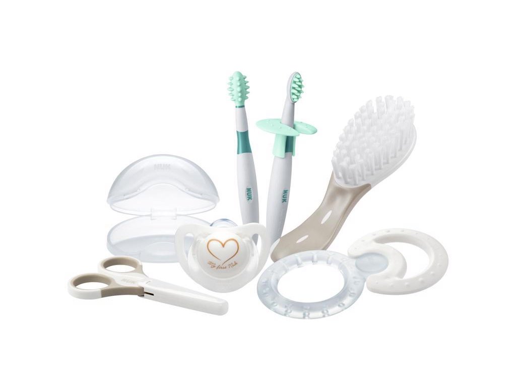 - NUK Set tréningových kefiek - Zubná kefka a masážna kefka v nových moderných farbách s bezpečnostnou zarážkou (6 mesiacov+)