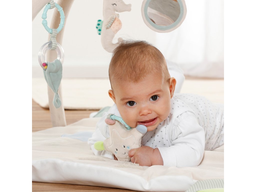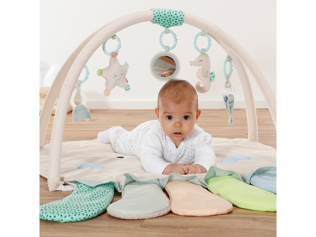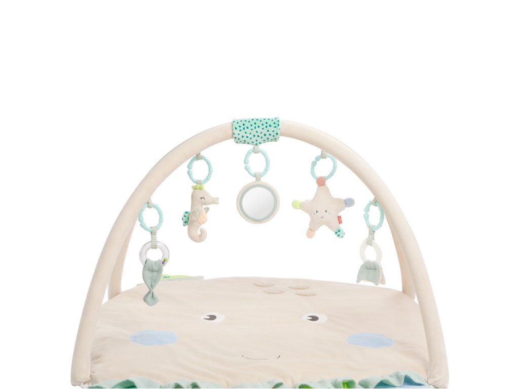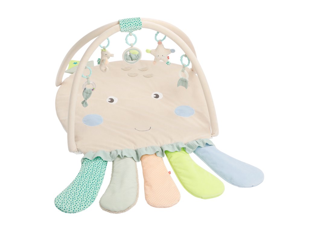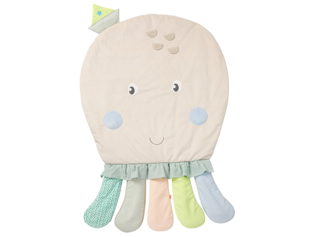 Na 3D deke na hranie v tvare chobotnice z kolekcie Children of the Sea je toho veľa na objavovanie. Malé morské živočíchy na deke podporujú cielené uchopenie a koordináciu rúk a očí. Prívesky s hrkajúcim krúžkom, hlasom zvieratka, zrkadielkom, hrkálkou, mäkkým hryzátkom a zmesou materiálov podporujú pozornosť dieťaťa a hravou formou rozvíjajú hmatové, sluchové a motorické zručnosti.