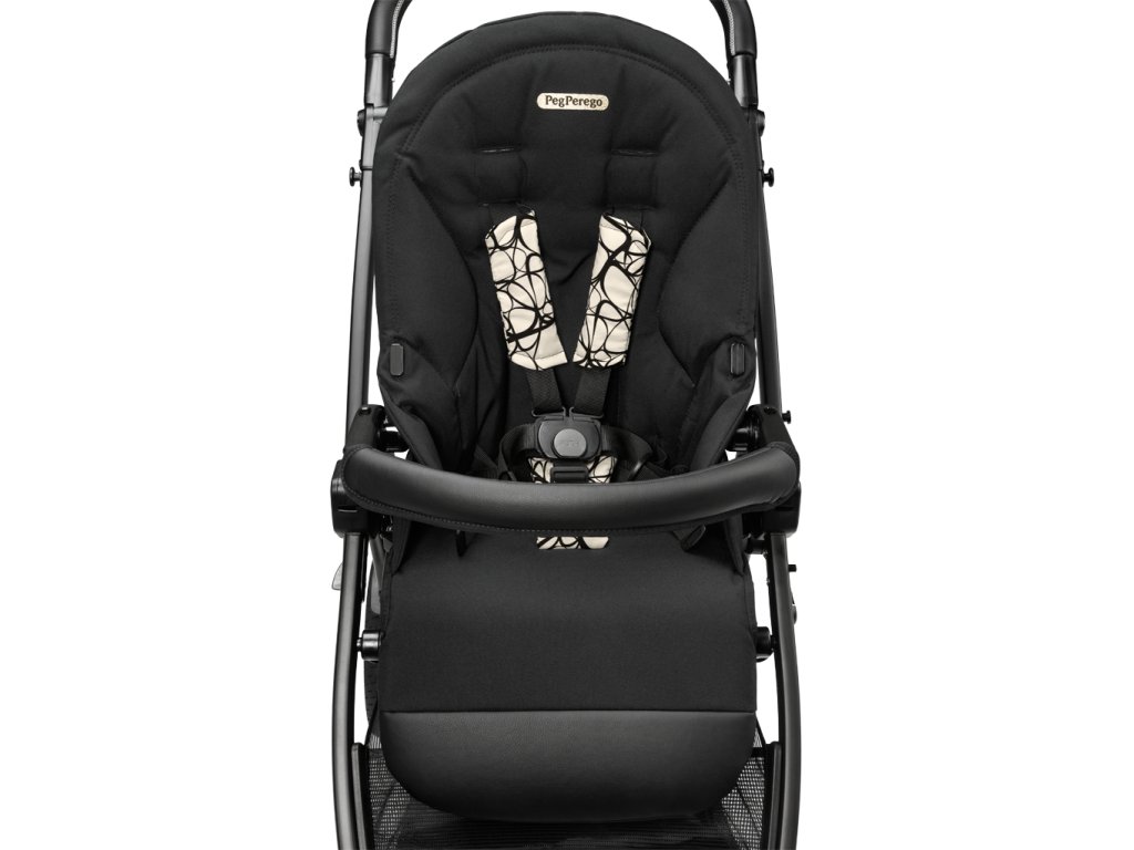 Pohodlí a funkčnost zaručuje prostorný sedák, 5bodový pás a přední madlo z ekokůže, která se snadno otevírá a zavírá.