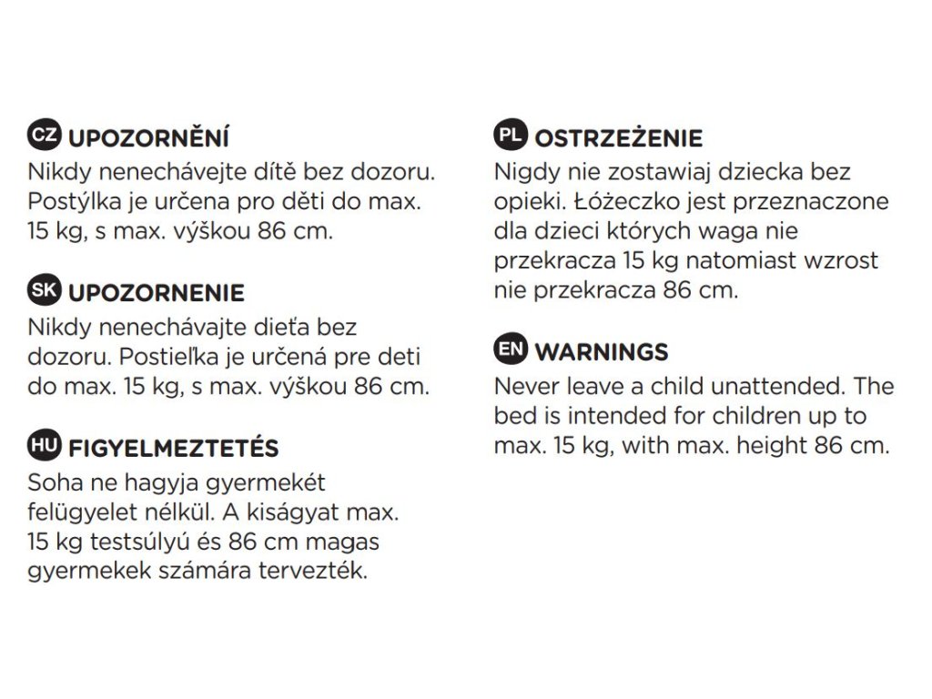 UPOZORNENIE! Nikdy nenechávajte dieťa bez dozoru. Postieľka je určená pre deti do max 15 kg, s max výškou 86 cm.