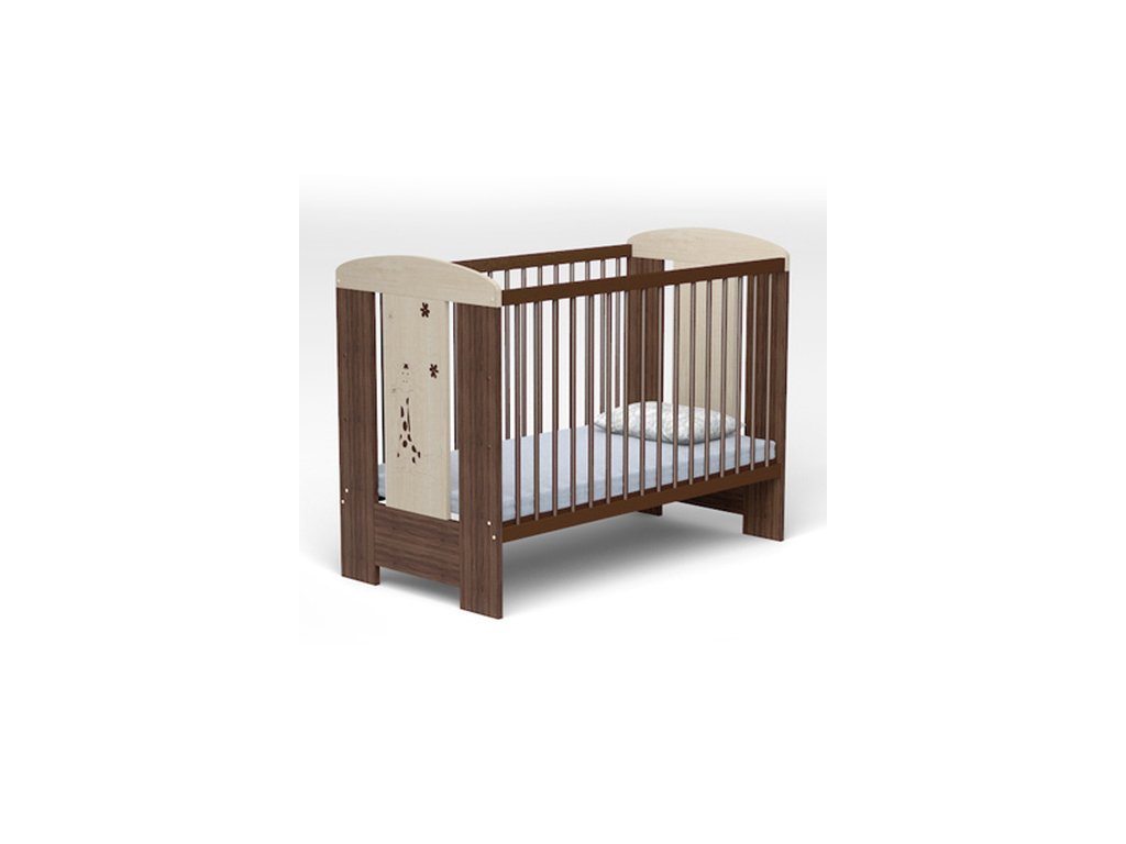 Moderná detská postieľka vyrobená z laminovanej drevotriesky s bočnicami a s roštom z masívu.