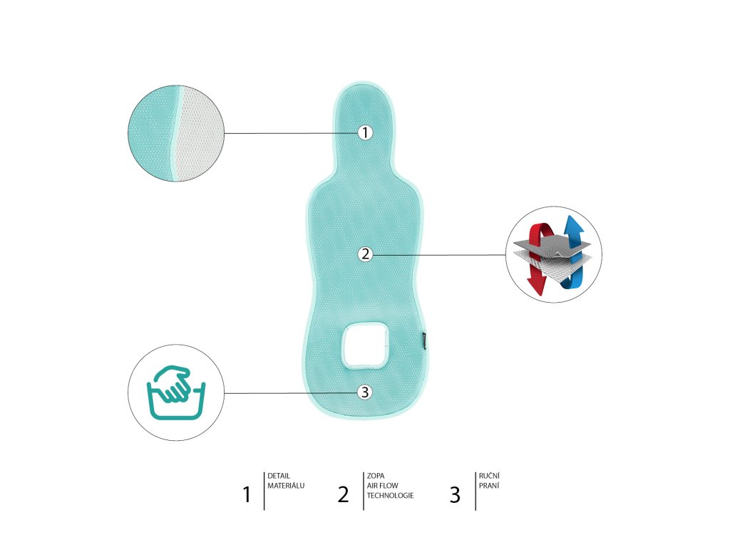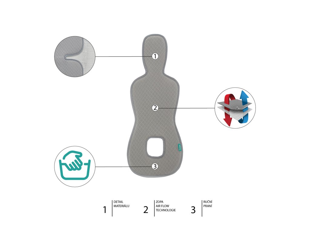 Priedušnosť zaisťuje unikátna technológia Zopa Air Flow, látka s 3D hexagon štruktúrou dovoľujúci prúdenie vzduchu cez vložku, medzi autosedačkou a dieťaťom.