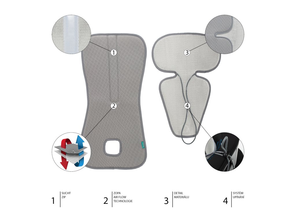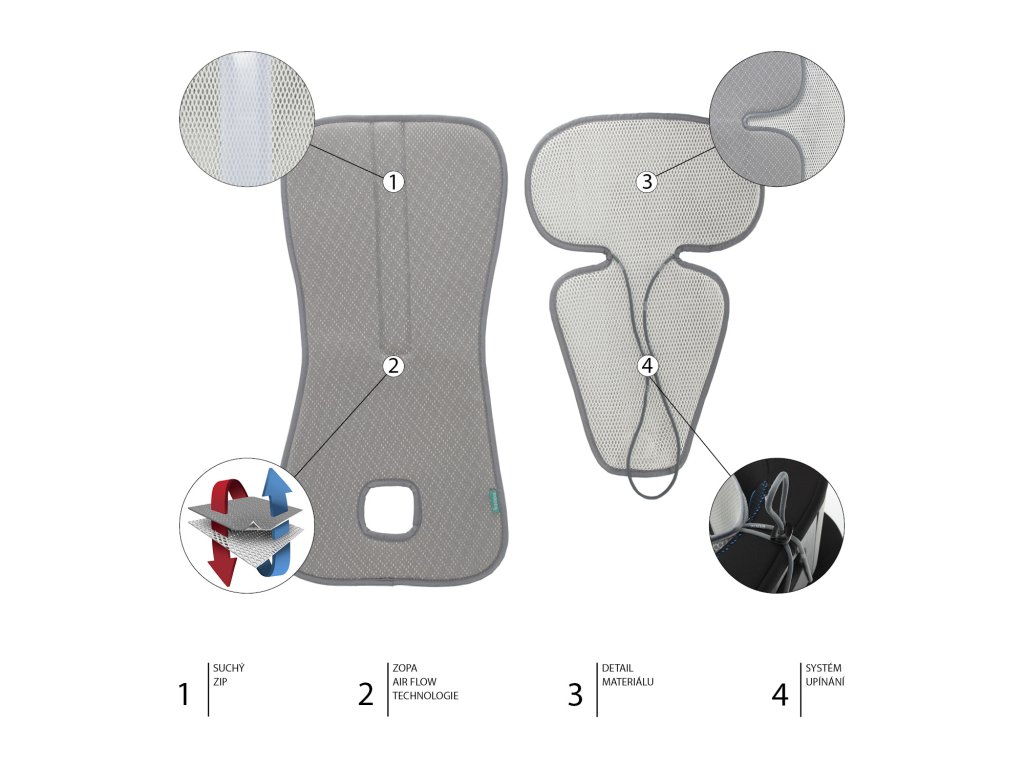 Priedušnosť zaisťuje unikátna technológia Zopa Air Flow, látka s 3D hexagon štruktúrou dovoľujúci prúdenie vzduchu cez vložku, medzi autosedačkou a dieťaťom.