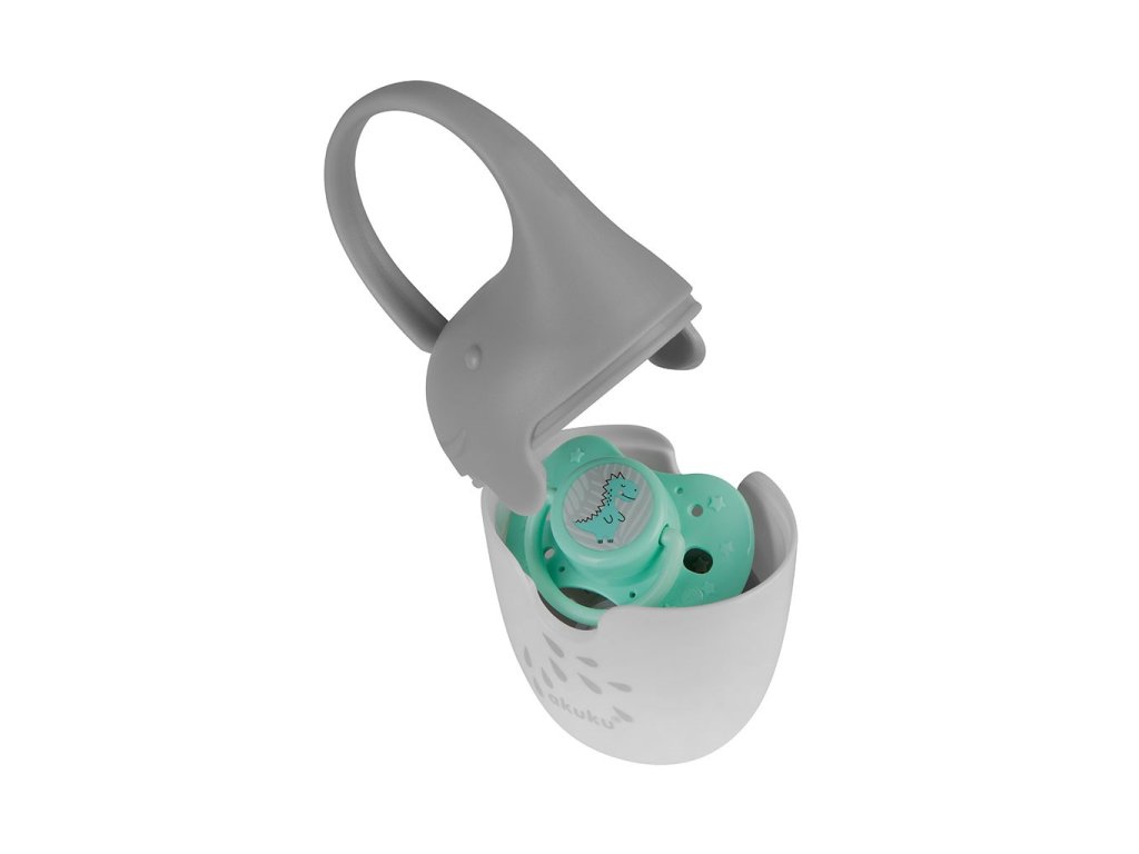 Praktický držiak na cumlík je veľmi užitočný pri cestovaní alebo prechádzkach. Chráni cumlík pred znečistením a poškodením. Veľmi ľahko sa používa a jednoducho sa pripevňuje na kočíky, autosedačky, tašky alebo zábrany postieľok. Pojme až 2 cumlíky. Neutrálne a príjemné farby sa hodia ku každému kočíku a taške. Nádoba má tvar slona.