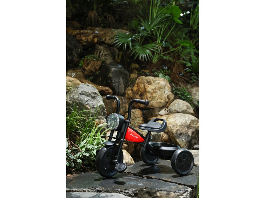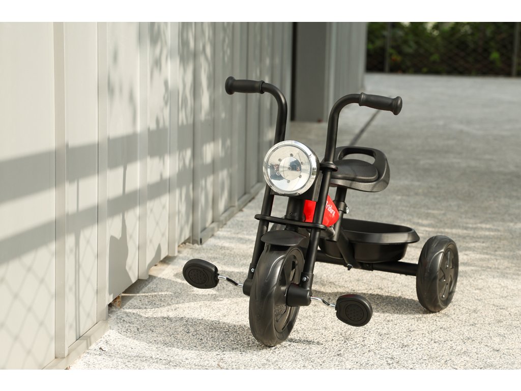 - Motorkársky dizajn: Trojkolka má jedinečný dizajn motorky, ktorý jej dodáva štýlový vzhľad. Motorková palivová nádrž prispieva k dizajnovému efektu a robí trojkolku skutočne jedinečnou.