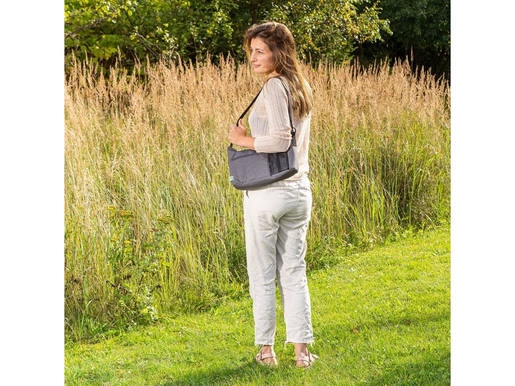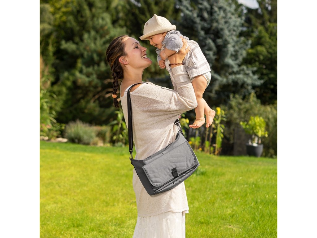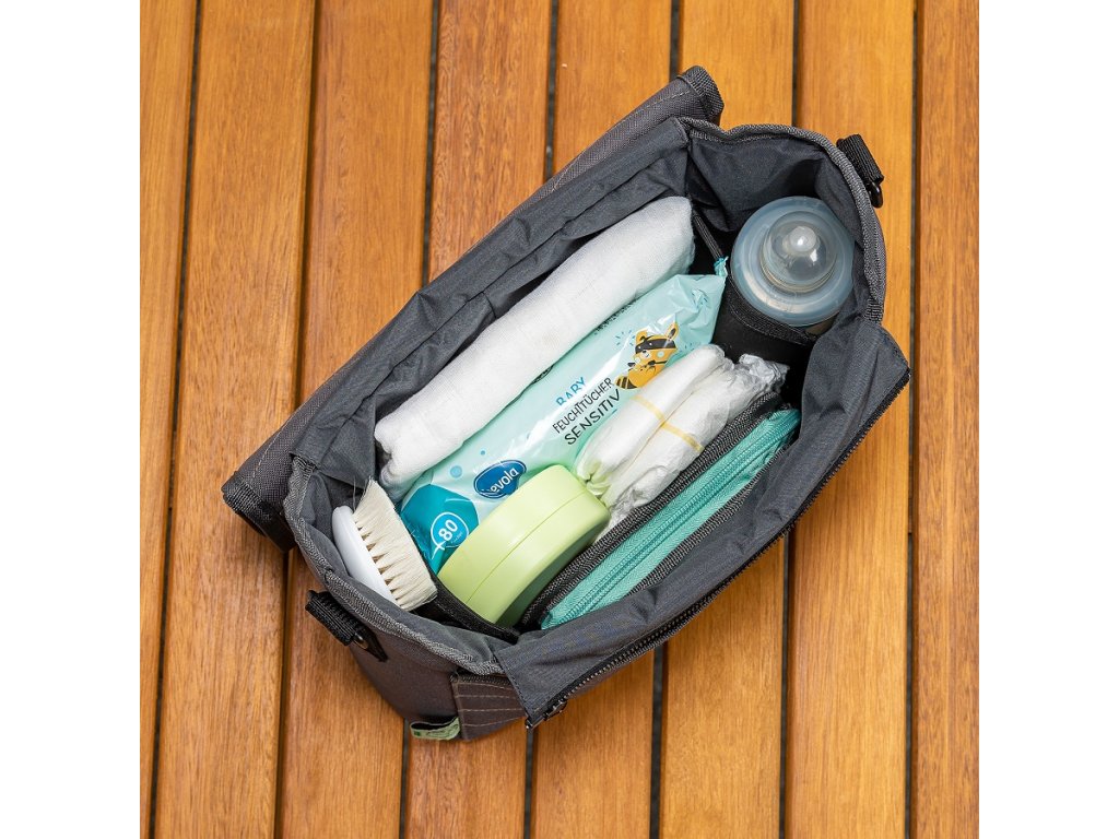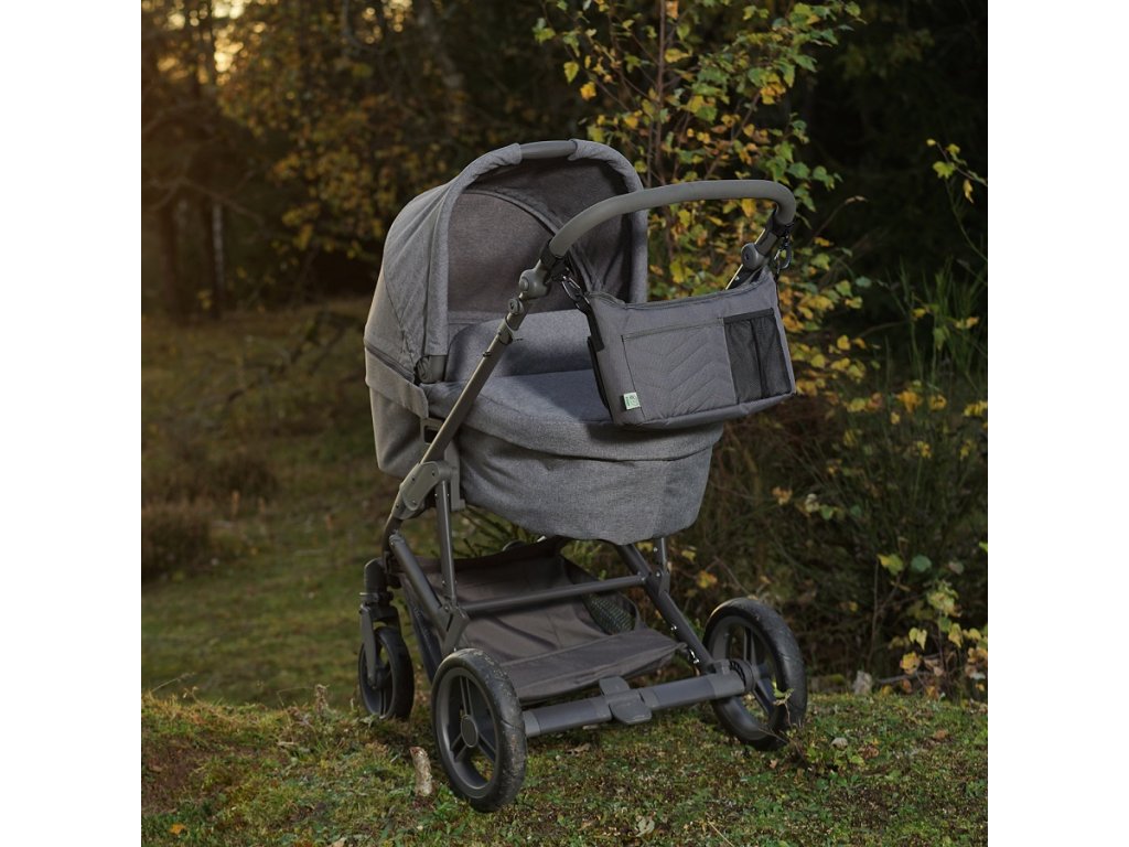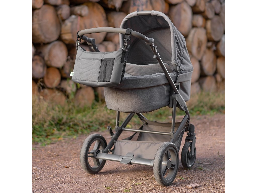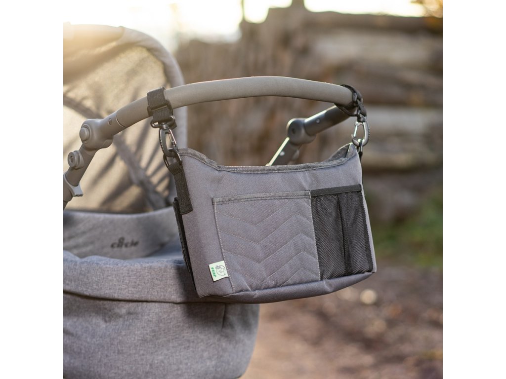 Organizér lze snadno připevnit ke kočárku. Jakmile si však kočárek nemůžete vzít s sebou, například proto, že si chcete s dítětem udělat krátkou pauzu v kavárně, lze tašku snadno přepravovat i bez kočárku. Díky délkově nastavitelným popruhům lze tašku nosit na jedné straně