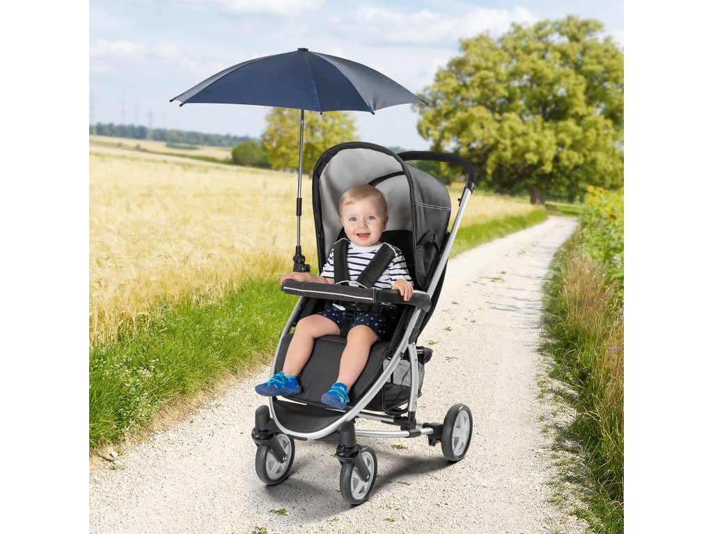 Univerzální držák se přizpůsobí šířce rámu jakéhokoliv kočárku. Slunečník lze bezpečně připevnit na konstrukce s kulatým i oválným profilem a to jak na rukojeť, tak i na přední madlo nebo třeba přímo na rám kočárku.