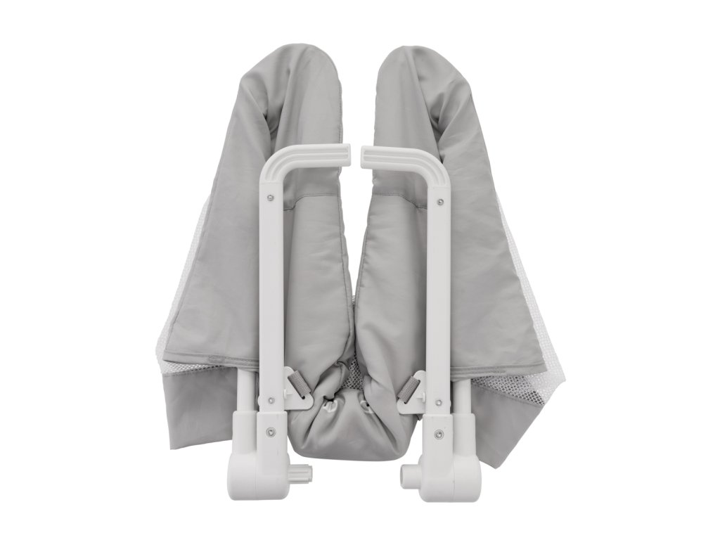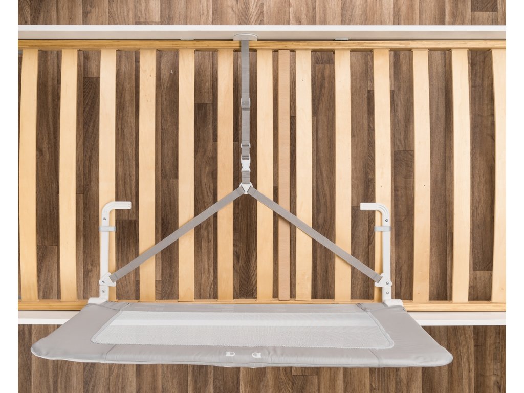 Díky integrované funkci sklopení může být posuvná zábrana snadno a pohodlně sklopena, když ji nepoužíváte. Stisknutím tlačítek na boku můžete uvolnit zámek a sklopit ji. To usnadňuje přístup k posteli a vašemu dítěti. (Sklopení není možné u všech typů postelí!).