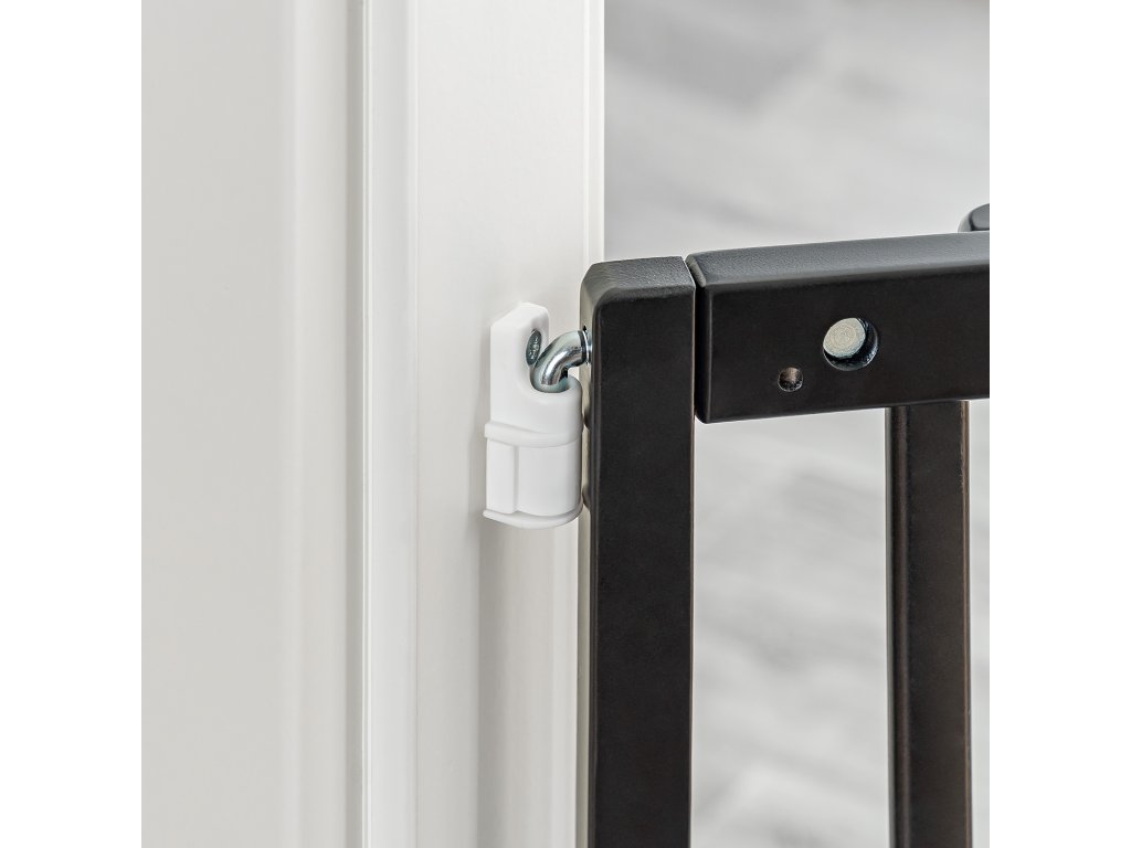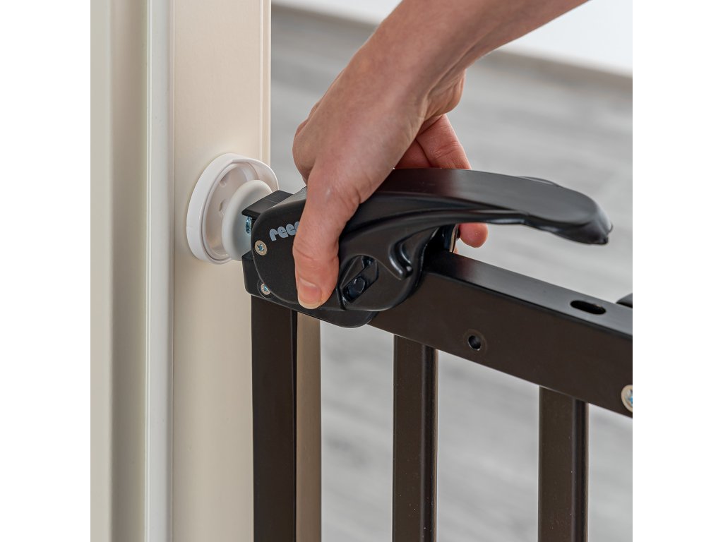 Aby vaše děti nemohly odemknout zamčenou zábranu, byla vybavena systémem aktivního zámku – dvojitým mechanismem otevírání. Jinými slovy, k odblokování bezpečnostní zábrany je třeba provést dvě akce současně. Dospělí jej však mohou rychle otevřít jednou rukou. Jednoduše stiskněte tlačítka na boku a zvedněte kliku nahoru, abyste zábranu odemkli.