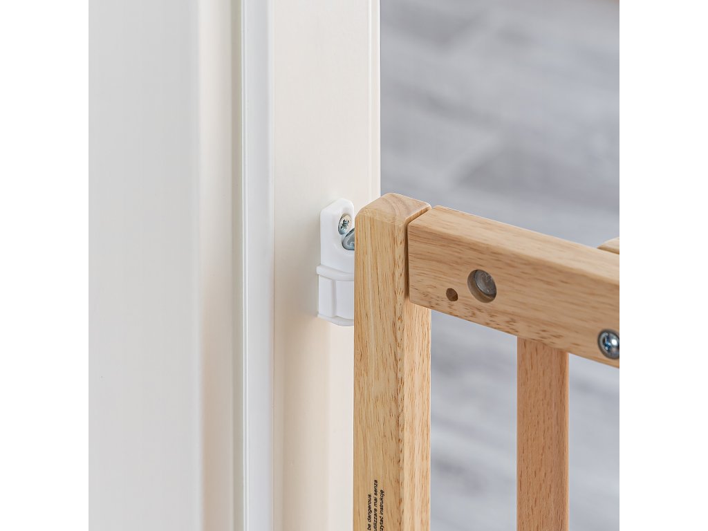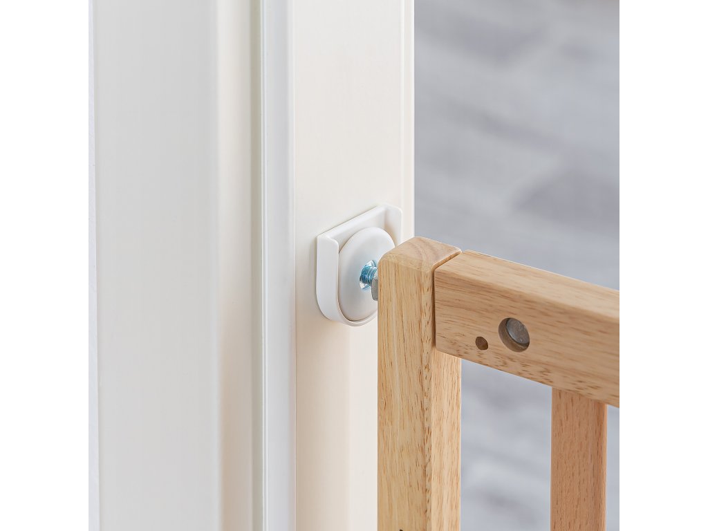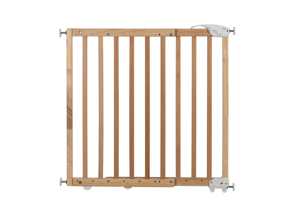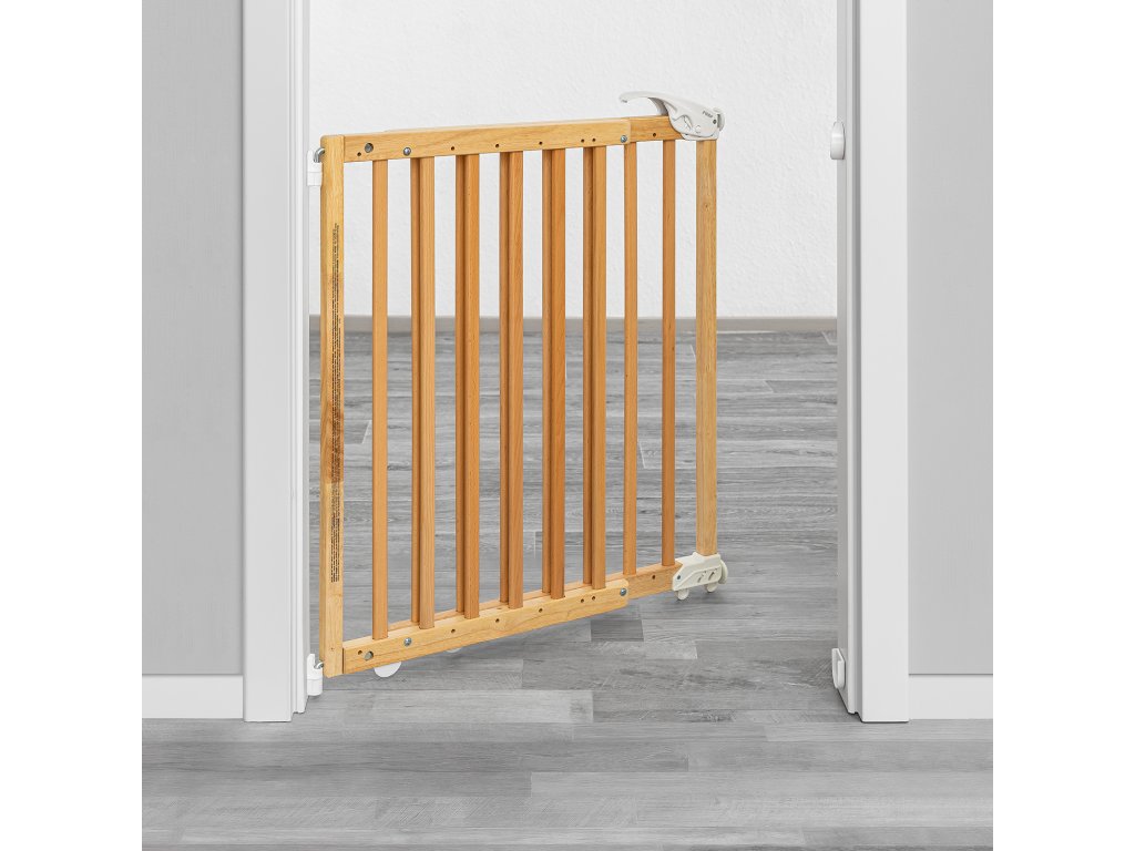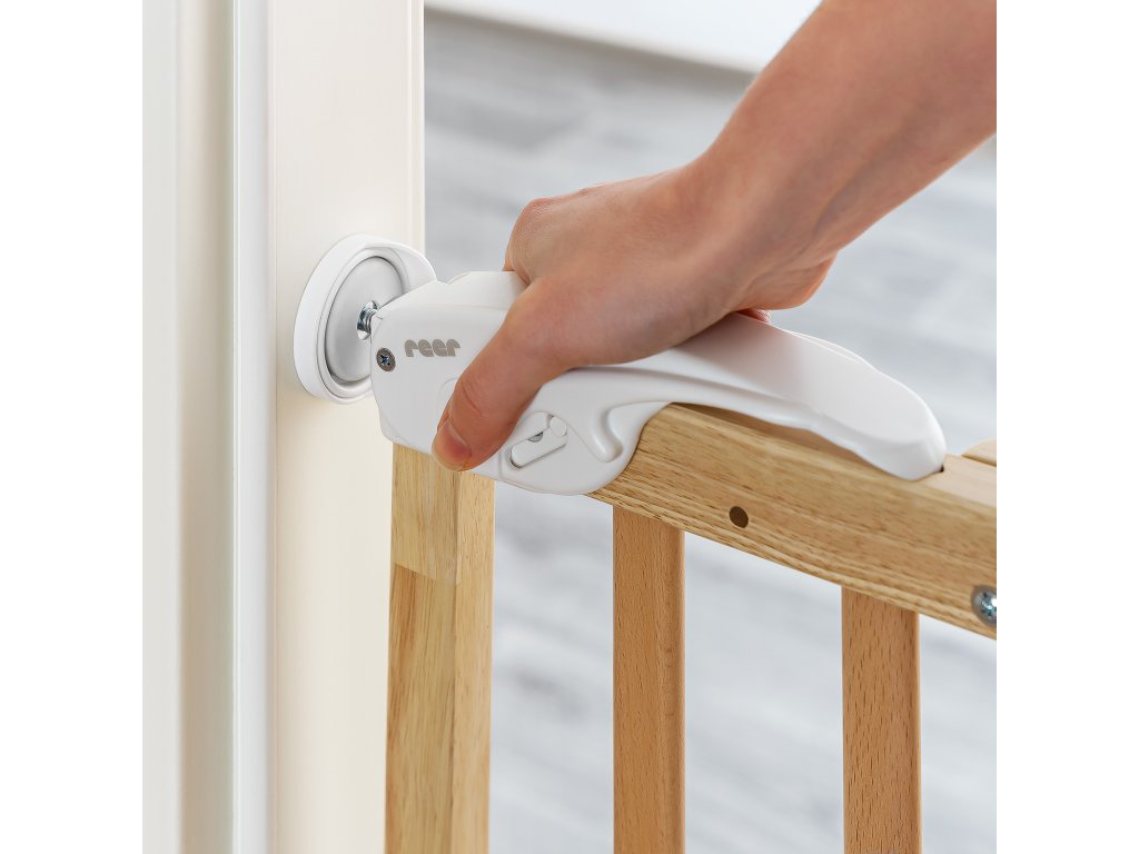 Aby vaše děti nemohly odemknout zamčenou zábranu, byla vybavena systémem aktivního zámku – dvojitým mechanismem otevírání. Jinými slovy, k odblokování bezpečnostní zábrany je třeba provést dvě akce současně. Dospělí jej však mohou rychle otevřít jednou rukou. Jednoduše stiskněte tlačítka na boku a zvedněte kliku nahoru, abyste zábranu odemkli.