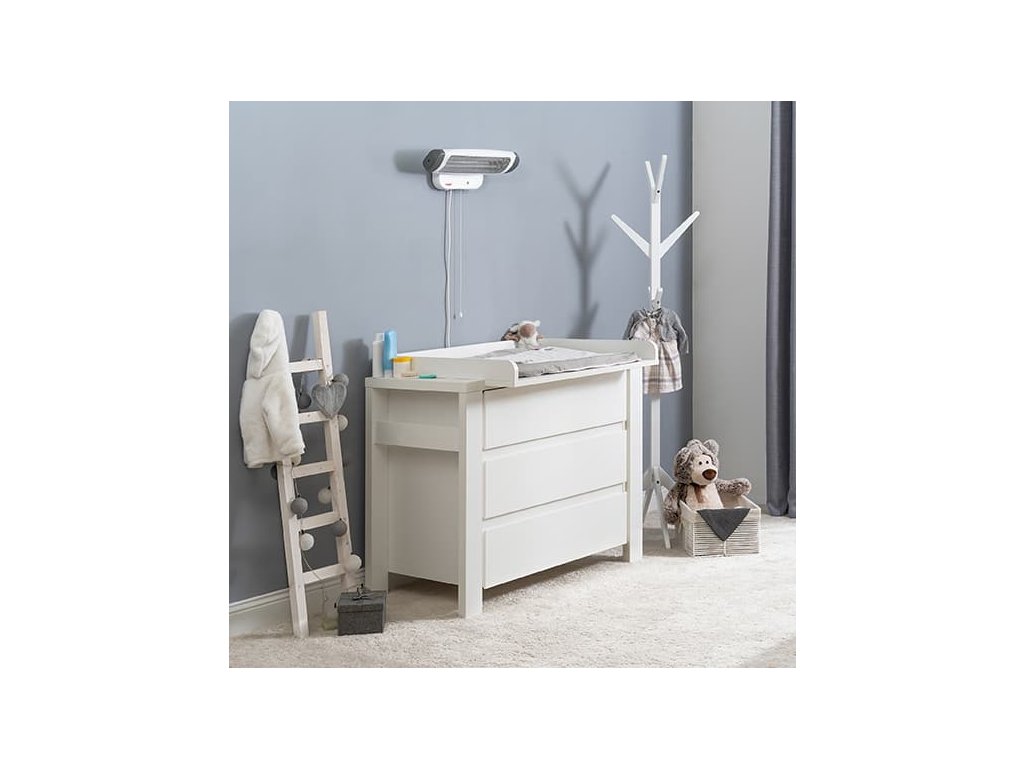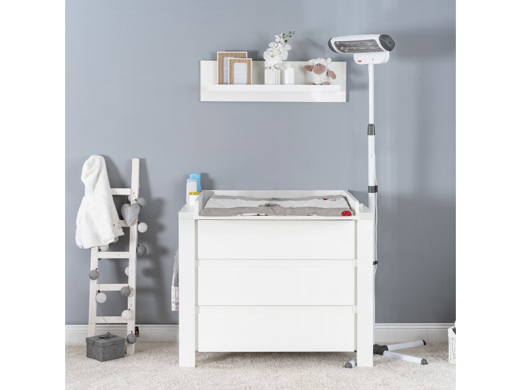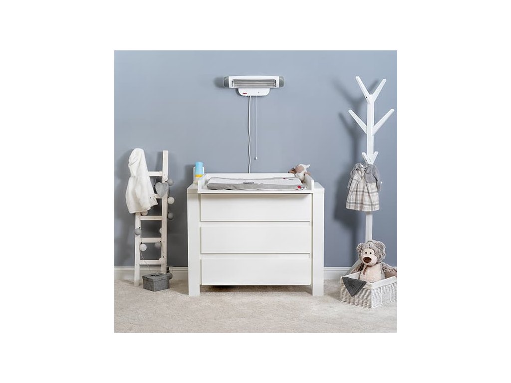 Díky základně lze zářič postavit kdekoli v místnosti. Přiložená montážní deska umožňuje pohodlnou montáž na stěnu nad přebalovacím pultem.