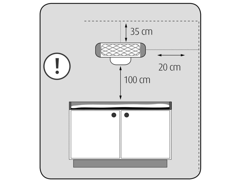 Díky odnímatelné montážní desce je připevnění zářiče velmi snadné. Tu lze pohodlně připevnit na zeď pomocí přiložených šroubů a hmoždinek. Díky montáži na stěnu je zářič velmi prostorově nenáročný a mimo dosah malých dětských ručiček.