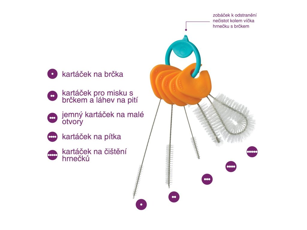 Tato sada kartáčků obsahuje všechny kartáčky, které potřebujete k čištění hrnečku s brčkem, lahví a termosek na pití. Kartáčky jsou na jednom kroužku. Kartáčky lze z kroužku sejmout a po použití jednoduše přicvaknout zpět.