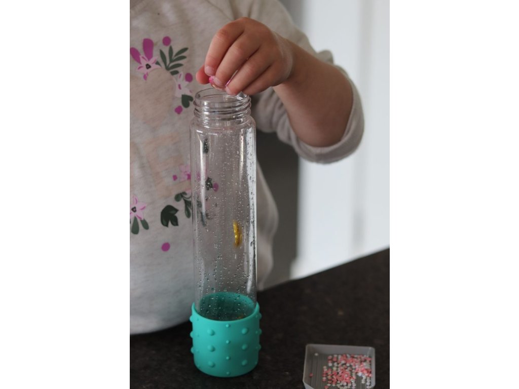 A jak se používá? Je to hračka! Stačí vysypat přiložený materiál, přidat vodu a vše je připraveno! Díky této možnosti můžete znovu naplnit a použít senzorickou láhev pro nekonečné hodiny zábavy. Obsah lahve lze obměnit jednou z náhradních náplní nebo využít jiný vhodný materiál.