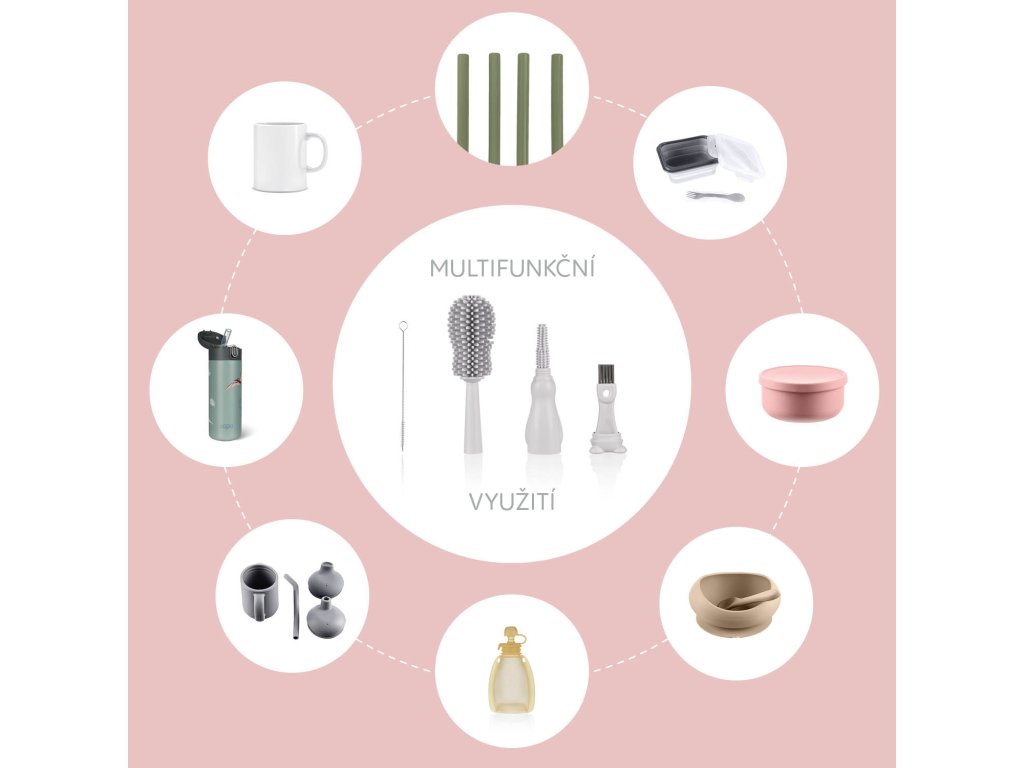 Objavte všestranného pomocníka pre ľahké a dôkladné čistenie všetkých detských fliaš bez obáv z poškriabania. Táto inovatívna silikónová kefa 3v1 ponúka rôzne čistiace plochy, ktoré vám pomôžu dosiahnuť dokonalú hygienu aj v ťažko dostupných miestach.