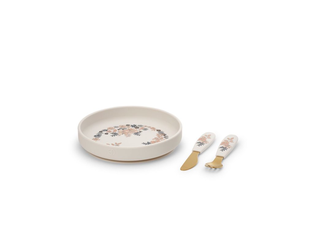 Krásný a praktický talířek Elodie je vyroben z potravinářského silikonu bez BPA. Talířek je lehký, měkký a díky silikonové části dobře přilne ke stolu a pomůže ho udržet na jednom místě. Vidlička a nůž je vyroben z nerezové oceli a silikonu. Zaoblený design talířku a tvarovaná vidlička usnadňují nabírání jídla.