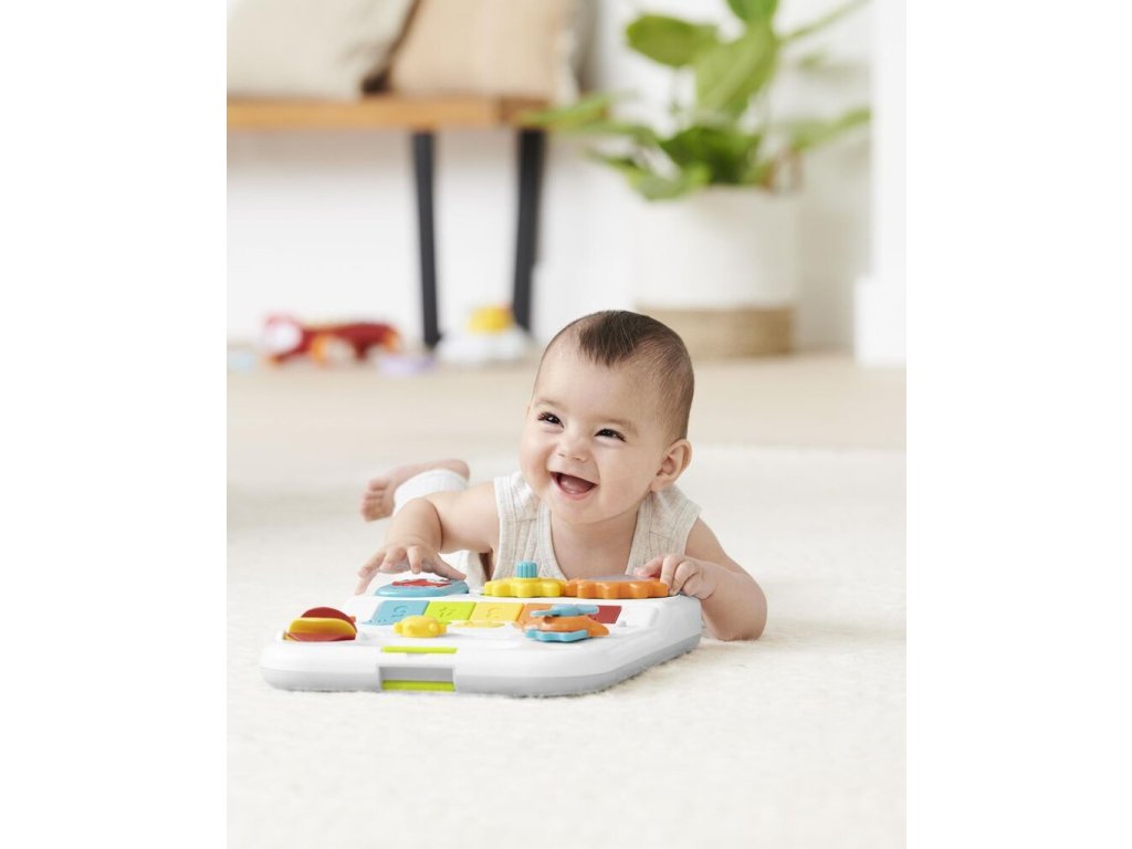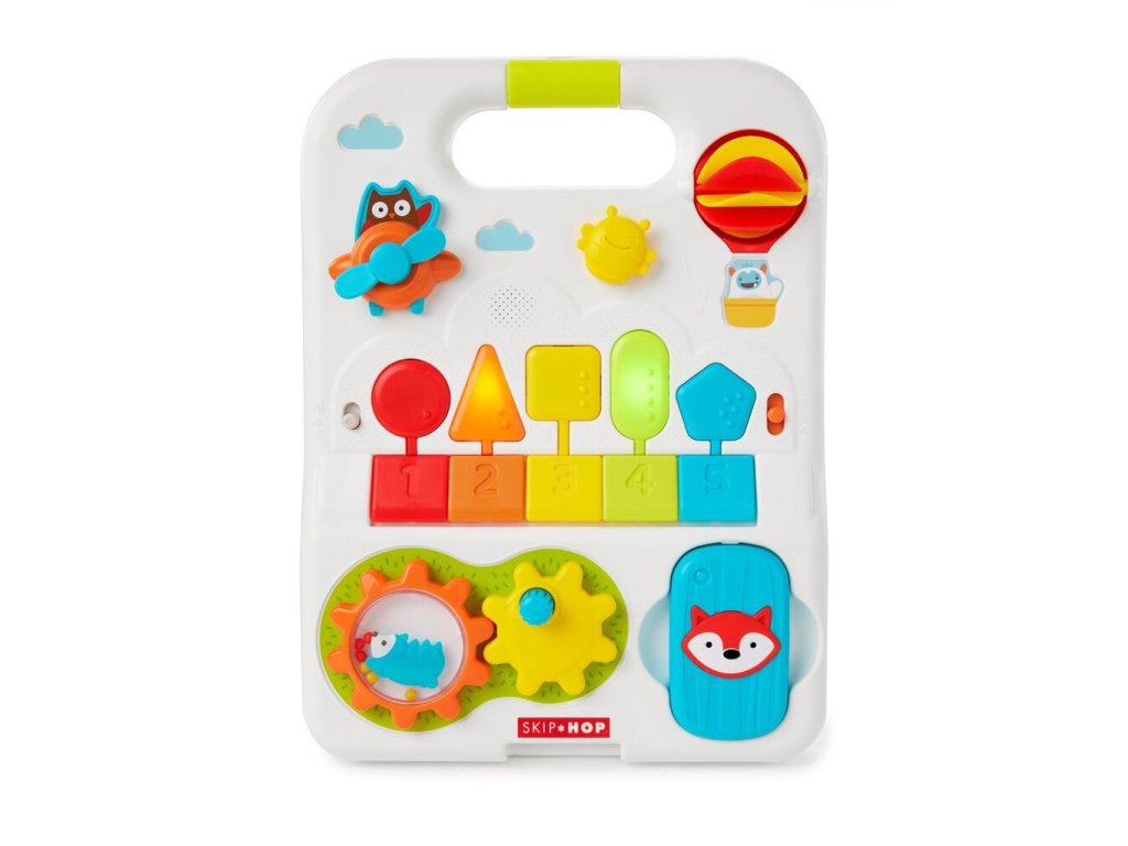 - panel obsahuje: aktívne lietadlo s vrtuľou, včielku Click-clack, otočnú vrtuľu teplovzdušného balóna, otočné ozubené kolieska, odnímateľnú hrkálka so zrkadlom pre bábätko