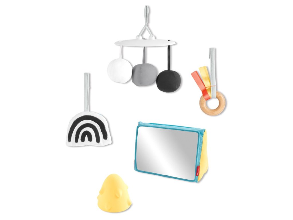 - 5 vývojových hračiek obsahuje: guličky usporiadané do stupnice, zrkadlo, drevený krúžok, dúhová hrkálka a hryzačku v tvare stromu.