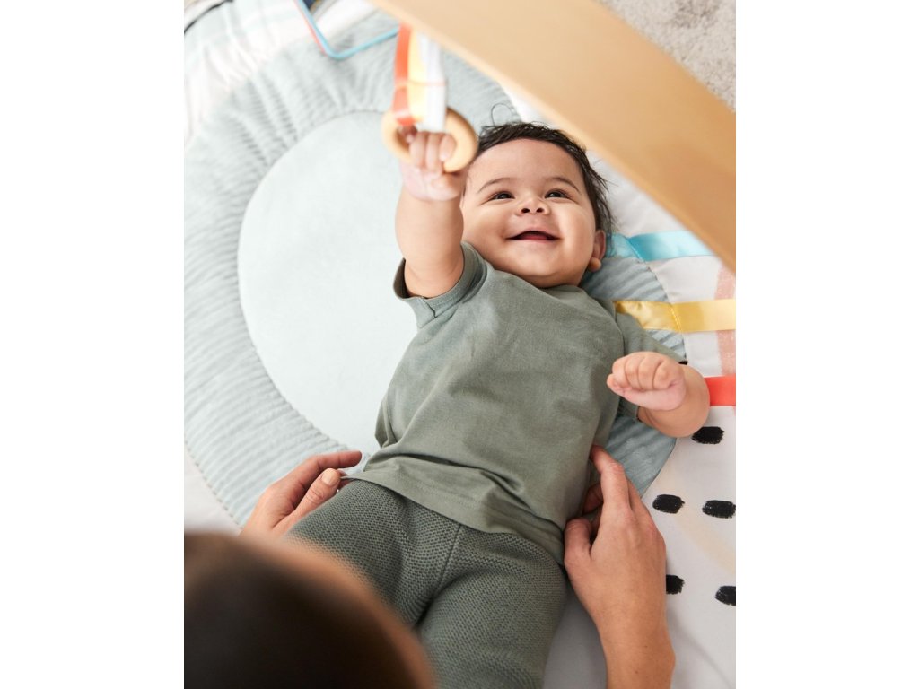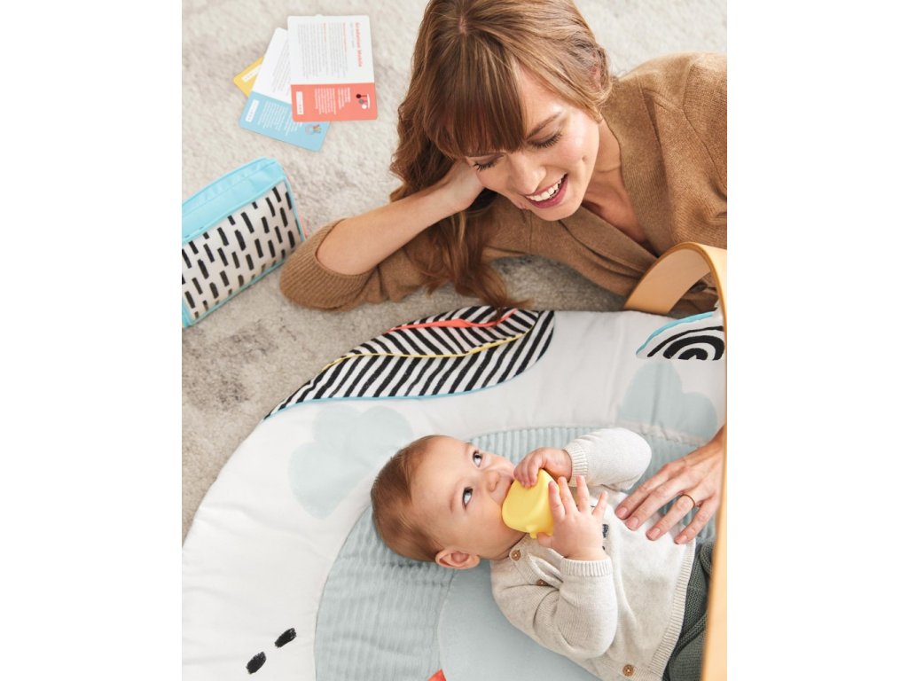 Hracia deka Discoverosity, navrhnutá v spolupráci s odborníkmi na Montessori vzdelávanie, ponúka rovnováhu medzi upokojujúcou jednoduchosťou a pútavým zmyslovým prostredím, ktoré podporuje prirodzenú zvedavosť a rozvoj dieťaťa - od zraku a koncentrácie až po jemnú motoriku a ďalšie zručnosti. Päť vývojových hračiek inšpirovaných prírodou, hrazdička, ktorá je vyrobená z drevených oblúkov z udržateľných zdrojov a plyšová zmyslová podložka, ktorá obsahuje kontrastné vzory, zvuky žmurkania, detské zrkadlo a ďalšie prvky, ktoré podporujú samostatnú činnosť a skúmanie. Šesť rodičovských kariet vás prevedie hrou na hracej deke, ktorá sa riadi míľnikmi, takže vy a dieťa môžete spoločne objavovať, učiť sa a rásť.