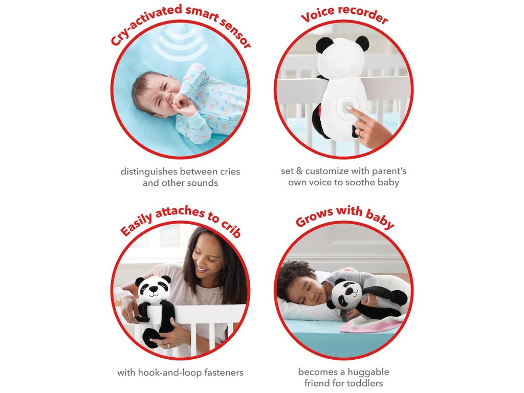 Inteligentný senzor plaču v podobe pandy upokojí dieťatko sladkými piesňami, zvukmi prírody a nahratým hlasom – dokonca aj uprostred noci! Tento plyšový priateľ automaticky reaguje na plač a krik dieťatka, aby sa upokojilo, čím sa bábätko a aj rodičia v noci lepšie vyspia. Jednoducho ho pripojte k postieľke. Prehráva 3 uspávanky a 3 upokojujúce zvuky. Umožňuje rodičom nahrať hlasový záznam po dobu 10 sekúnd.