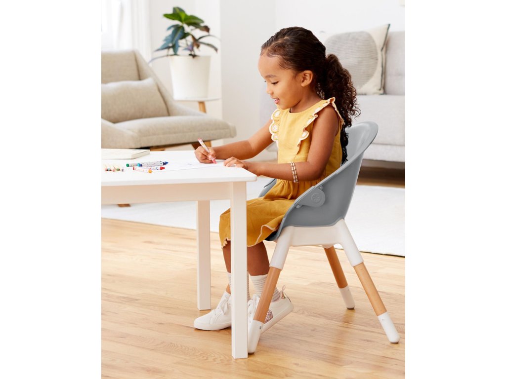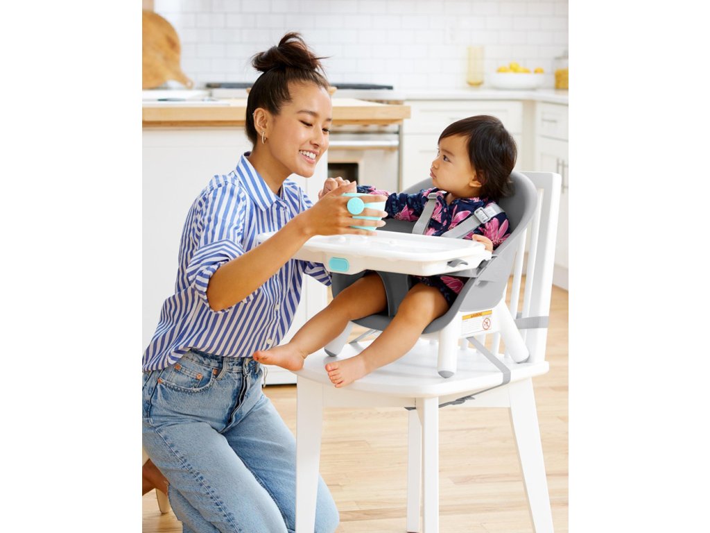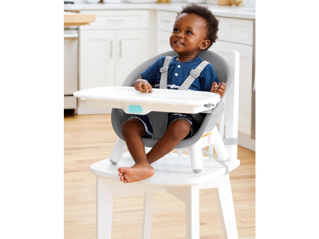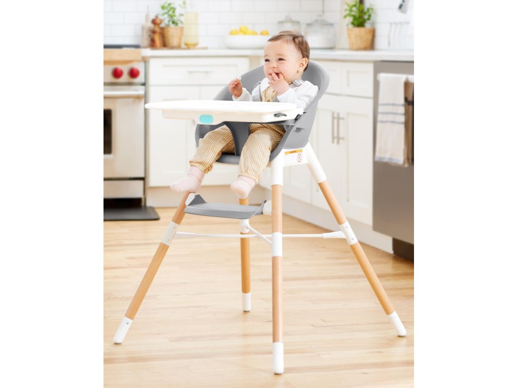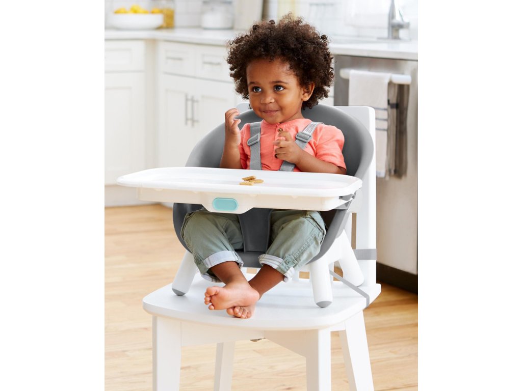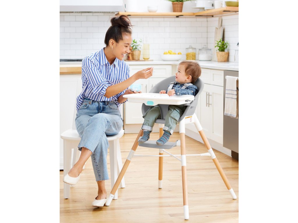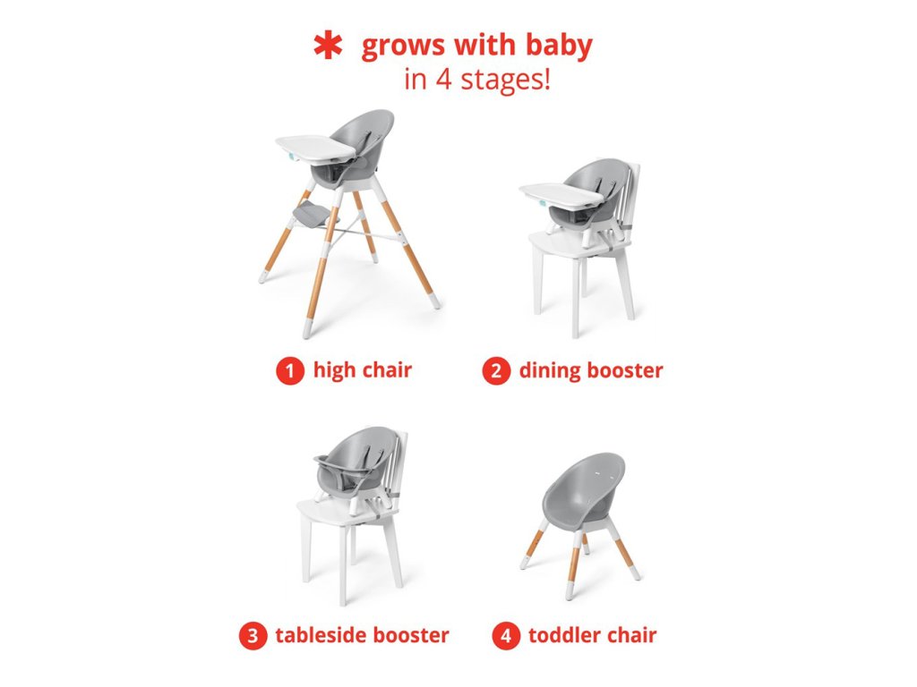 Jedálenská stolička EON 4v1 sa prispôsobí veku a potrebám dieťatka tak, aby ste ju mohli používať niekoľko rokov. Elegantný, moderný a priestorovo úsporný dizajn sa dokonale hodí do každého interiéru. Skip Hop EON má inovatívny dizajn s nohami z bukového dreva, elegantným šedým sedadlom, podnosom a 2-polohovou sivou opierkou na nohy. Podnos na vysokej stoličke je odnímateľný a nastaviteľný. Stoličku môžete využívať 4 rôznymi spôsobmi a to ako vysokú jedálenskú stoličku do hmotnosti dieťatka 15 kg, podsedák s podnosom, samostatný podsedák pre jedenie za stolom a detskú stoličku alebo kresielko vhodnú pre deti do 5 rokov alebo 36 kg.