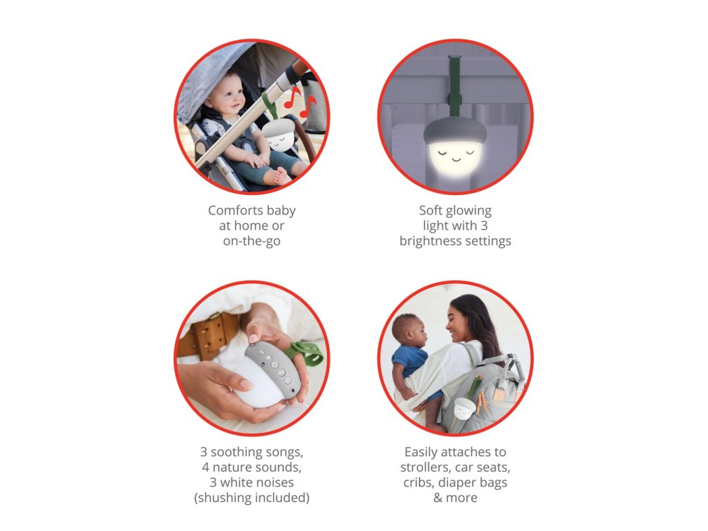 Vďaka trom upokojujúcim pesničkám, štyrom prírodným zvukom a trom možnostiam bieleho šumu (dokonca aj šušťavému zvuku) upokojí aj tých najväčších nezbedníkov. Pomocou praktického popruhu ho môžete pripevniť tam kde ho práve potrebujete (na postieľku, kočík,…)