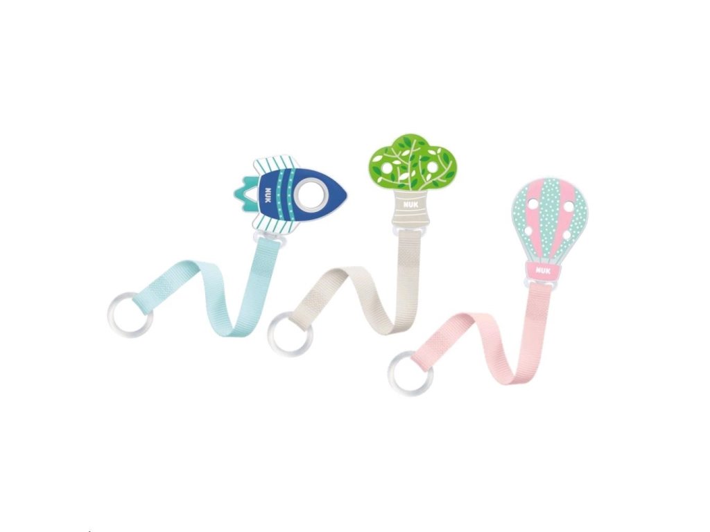 Veselá, farebná stužka na cumlík NUK s flexibilným krúžkom, je skvelým pomocníkom pre bábätká i rodičov. Nenahraditeľná zvlášť počas cestovania a prechádzok. Vďaka spone cumlík nespadne na zem a nezašpiní sa a nestratí sa. Má jednoduché použitie a je vyrobená tak, aby sa dala pripnúť k detskému oblečeniu. Pestré farby a veselé obrázky dieťa zaujmú. Určené pre deti od prvých dní života. Stužka je vhodná aj na dudlíky bez krúžku vďaka naťahovaciemu silikónovému krúžku. Systém klipu je bez ostrých hrán pre otváranie a zatváranie jednou rukou.