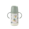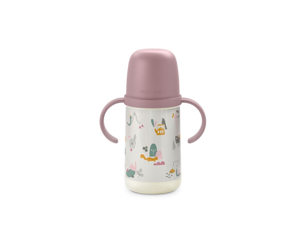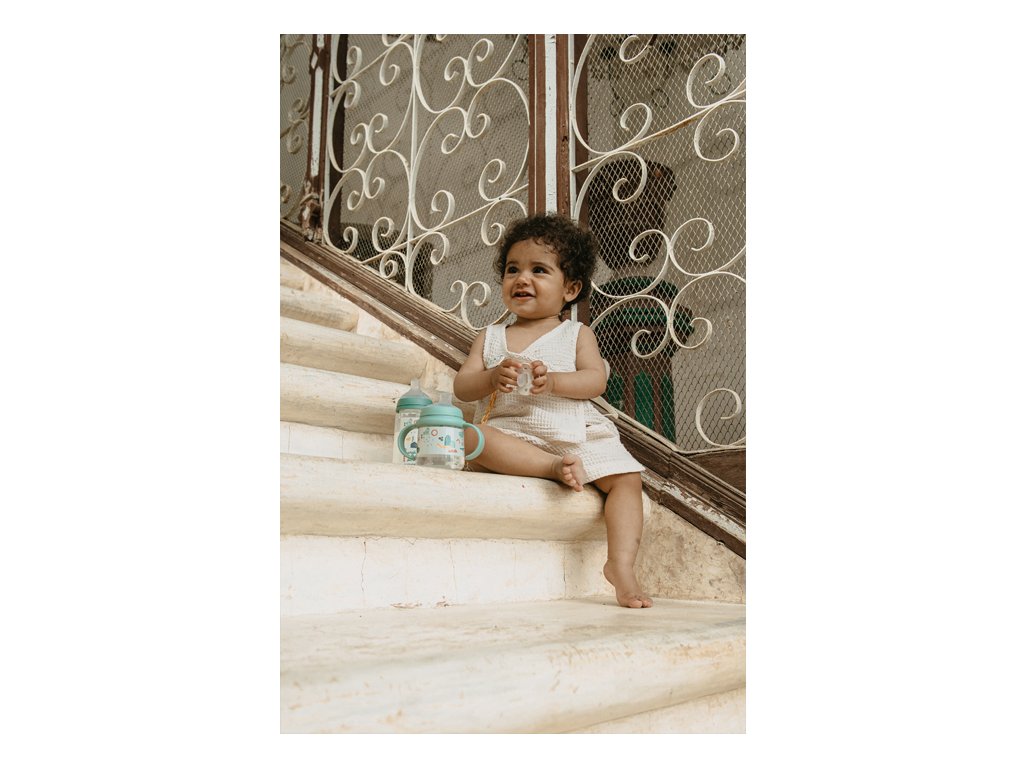 Druhá fľaša s uškami so špeciálnym cumlíkom uľahčuje prechod z dojčenskej fľaše na pitie z hrnčeka či pohára. Silikónový náustok je mäkký a materiálovo zhodný s cumlíkmi dojčenských fliaš, preto ho Vaše deti prijmú rýchlejšie ako bežná tvrdá pítka. Prvá fľaša má ergonomický tvar a držadlá vhodná pre drobné detské ruky, ktoré umožnia jej ľahké uchopenie.