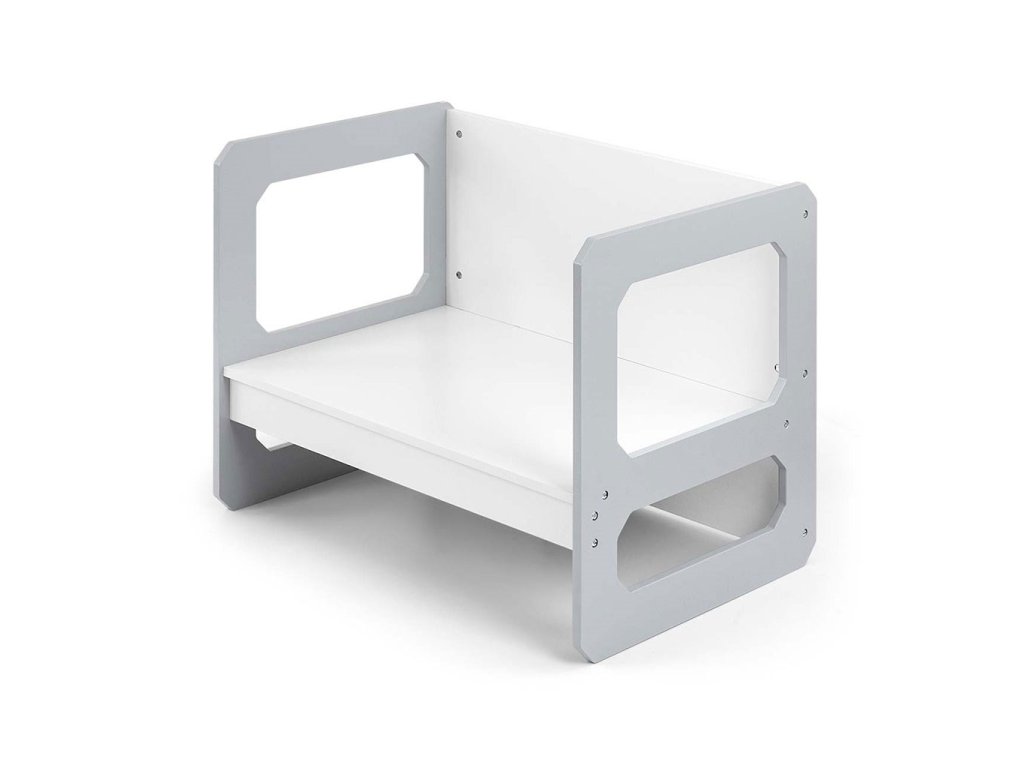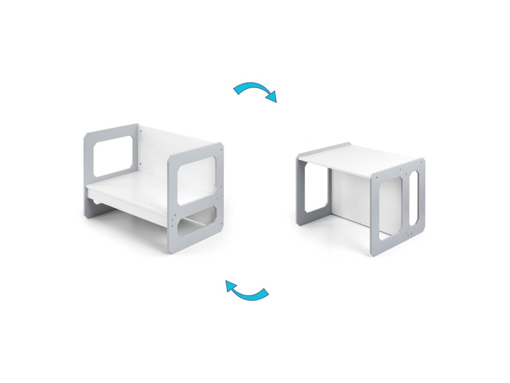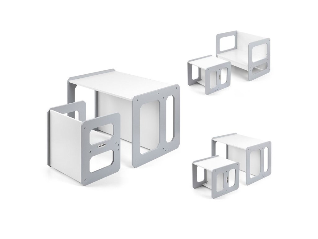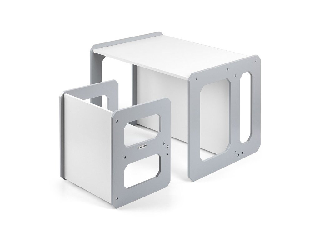 Sada sa skladá z jedného stolíka a jednej stoličky, ktoré vďaka modulárnej konštrukcii môžu plniť rôzne funkcie – stolík je možné premeniť na väčšie sedadlo a stolička sa výborne hodí ako menší stolík alebo sedadlo bez operadla pre staršie dieťa. Vďaka svojej ľahkej konštrukcii je tento nábytok ľahko prenosný, čo umožňuje deťom prispôsobiť si ho podľa svojich potrieb.