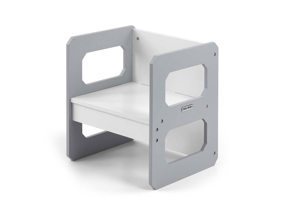 Sada nábytku 3v1 Stella v farebnej kombinácii bielej a šedej so šedými doplnkami, navrhnutá s ohľadom na zabezpečenie deťom: pohodlia, priestoru na kreatívne hranie, maľovanie, písanie a maximálneho komfortu počas činností.