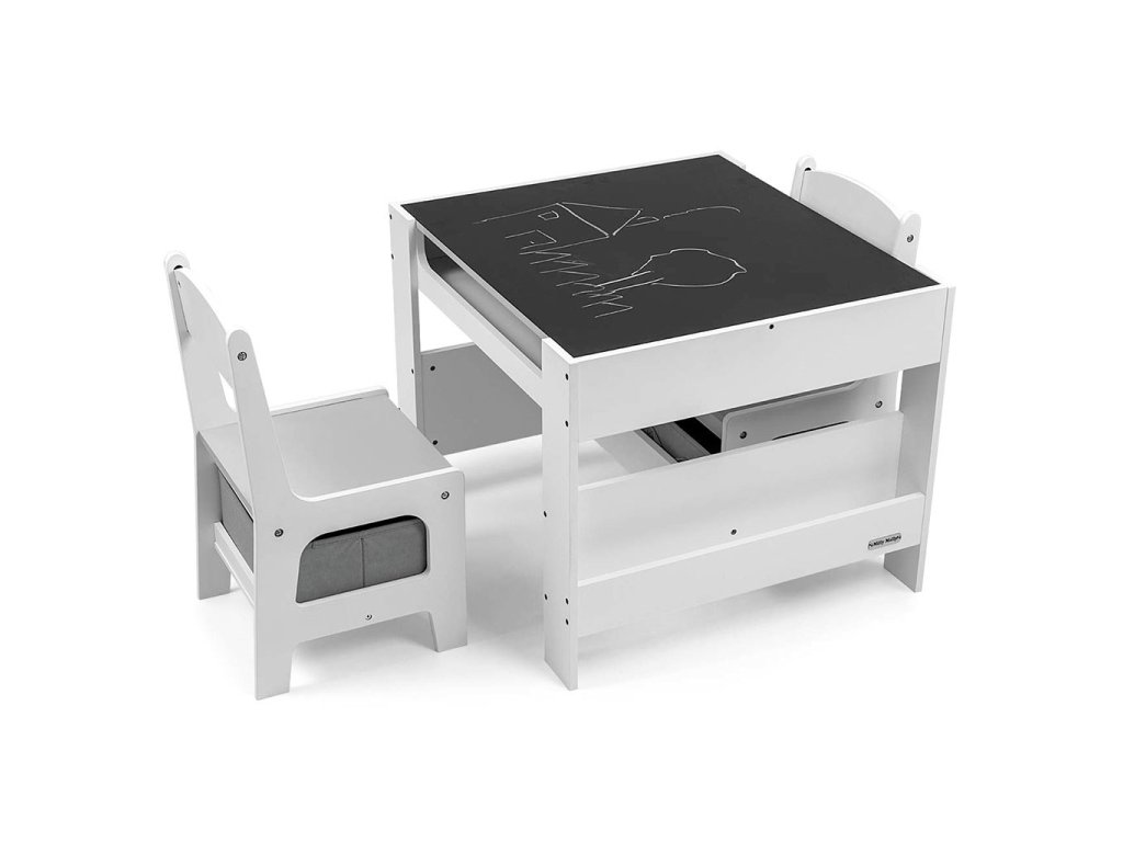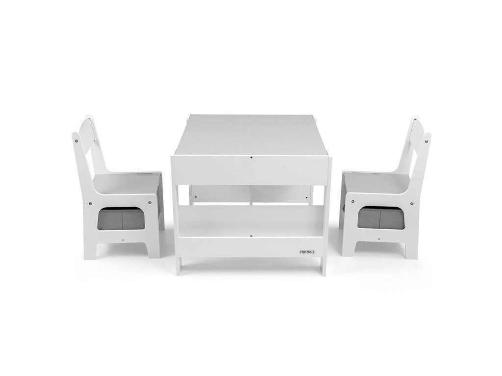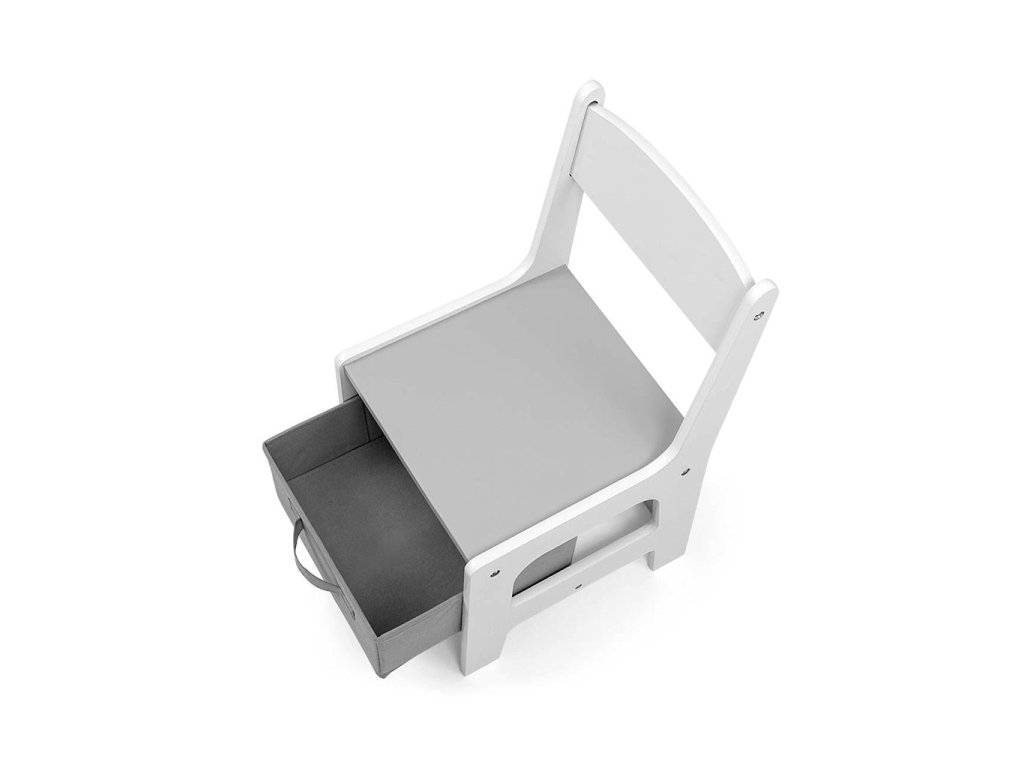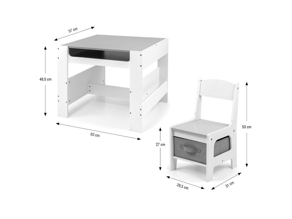 Súprava multifunkčného nábytku pre deti. Stôl SVEN s 2 stoličkami v bielej a sivej farbe so sivými doplnkami je vyrobený tak, aby deťom poskytoval: pohodlie, priestor na tvorivú hru, maľovanie, písanie a maximálne pohodlie počas aktivít. Súprava obsahuje 2 stoličky s 2 textilnými úložnými pomôckami zasunutými do poličky pod stoličkami. Stôl je vybavený obrovským úložným priestorom umiestneným pod obojstrannou odnímateľnou doskou. Má aj bočné úložné poličky. Na jednej strane stolovej dosky sa nachádza veľká kresliaca doska. Stoličky sú ľahké a deti s nimi môžu voľne pohybovať. Nábytok je vyrobený s výnimočnou precíznosťou a starostlivosťou. Obe stoličky majú zaoblené rohy, ktoré chránia dieťa pred zranením. Všetky prvky konštrukcie stola a stoličiek zabezpečujú vysokú stabilitu a minimalizujú riziko pádu. Súprava Sven je vyrobená z MDF je odolná a ľahko sa udržiava. Súprava nábytku sa ľahko zostavuje a všetky komponenty potrebné na montáž sú súčasťou balenia.