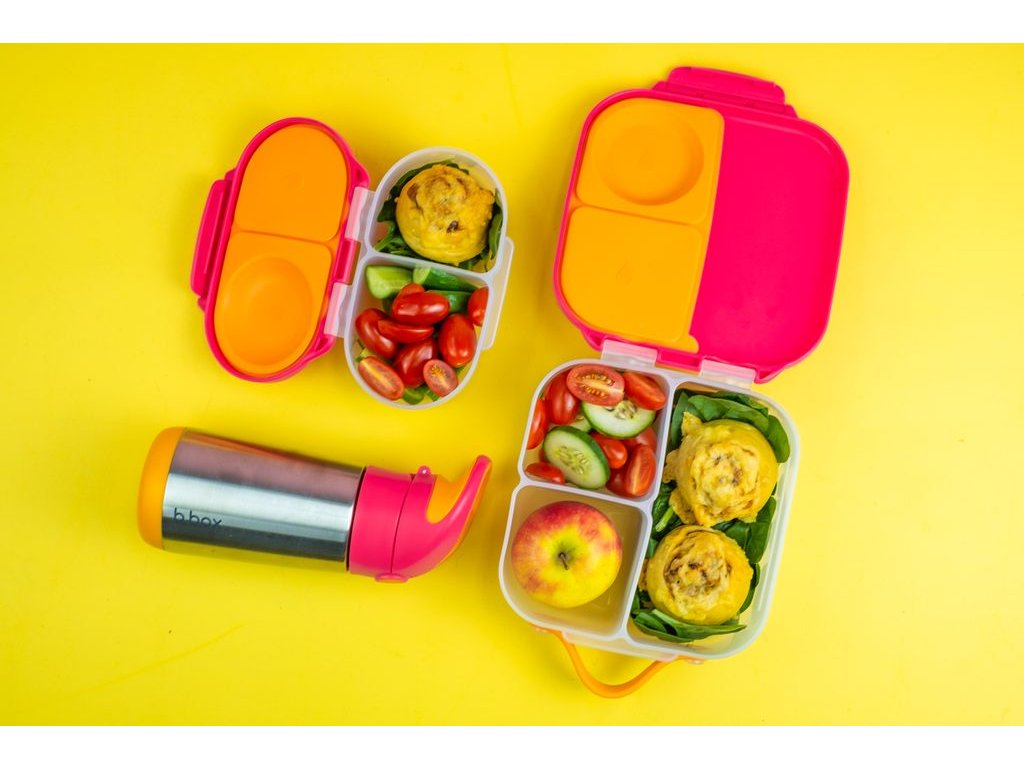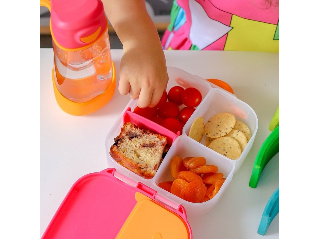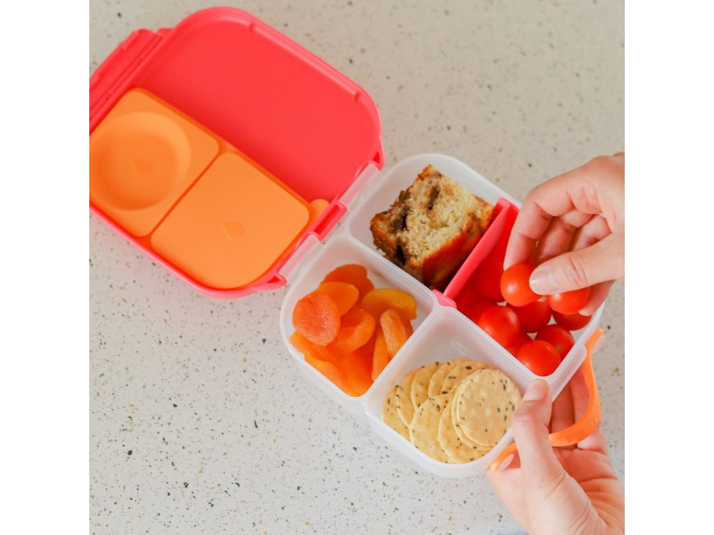 Všechny věci, které milujete na velkém svačinovém boxu od b.box najdete nyní i v menší verzi! Krabička na svačinu, do které se vejde úplně všechno. b.box navrhl variabilní lunchbox, do kterého zabalíte nespočet různých druhů svačinek. Najdete zde oddělení pro ovoce, zeleninu, nebo na čtvrtky nakrájený toast. Naprosto jedinečné zpracování víčka krabičky s elastickým kroužkem umožní vložit do krabičky celé jablko! Silikonové dvojité víčko pak dovolí skladovat v menších odděleních jogurt nebo dip (nikoli tekutiny). Některé vnitřní "přepážky" jsou vyjímatelné a nastavitelné, takže si tento svačinový box přestavíte podle svých chutí a potřeb. Do lunchboxu se vejde například i wrap nebo banán, je jen na vás, co dítěti do tohoto svačinového boxu zabalíte :-). Jednoduché otevírání umožní dětem samostatně se obsloužit.