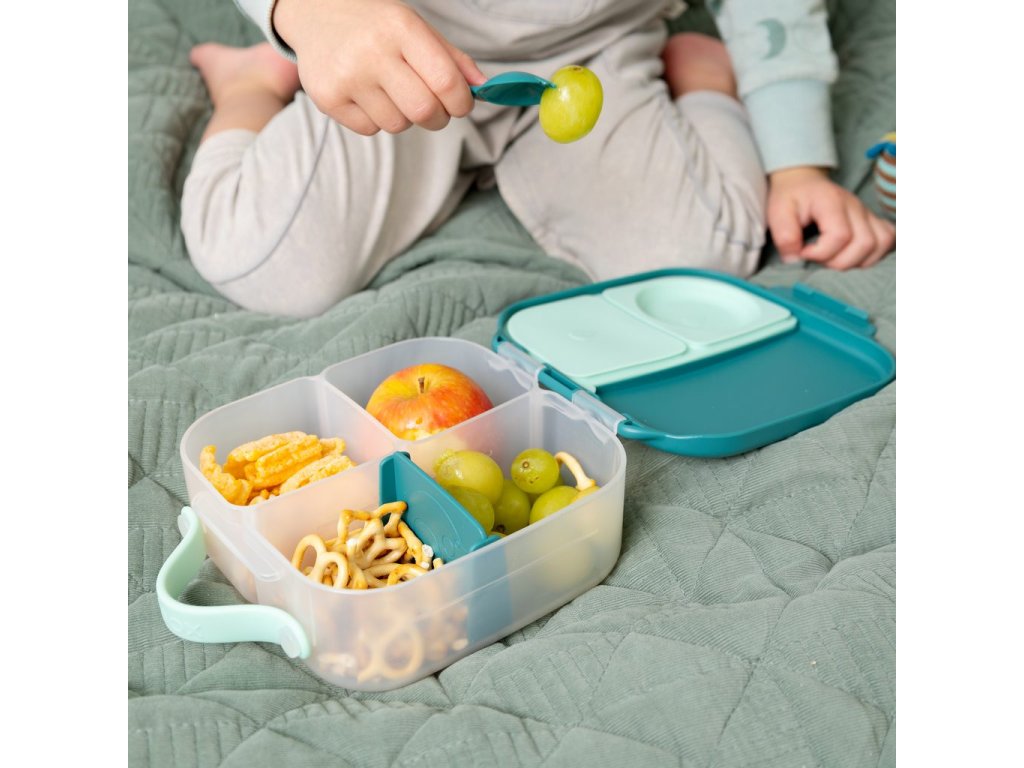 Všechny věci, které milujete na velkém svačinovém boxu od b.box najdete nyní i v menší verzi! Krabička na svačinu, do které se vejde úplně všechno. b.box navrhl variabilní lunchbox, do kterého zabalíte nespočet různých druhů svačinek. Najdete zde oddělení pro ovoce, zeleninu, nebo na čtvrtky nakrájený toast. Naprosto jedinečné zpracování víčka krabičky s elastickým kroužkem umožní vložit do krabičky celé jablko! Silikonové dvojité víčko pak dovolí skladovat v menších odděleních jogurt nebo dip (nikoli tekutiny). Některé vnitřní "přepážky" jsou vyjímatelné a nastavitelné, takže si tento svačinový box přestavíte podle svých chutí a potřeb. Do lunchboxu se vejde například i wrap nebo banán, je jen na vás, co dítěti do tohoto svačinového boxu zabalíte :-). Jednoduché otevírání umožní dětem samostatně se obsloužit.