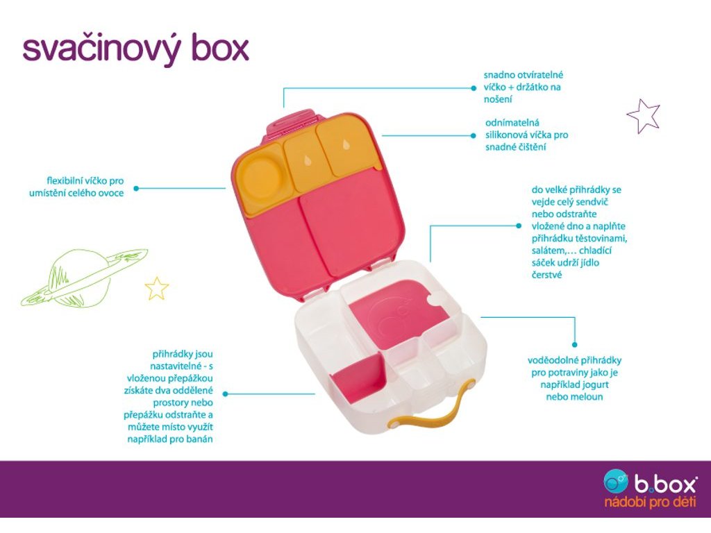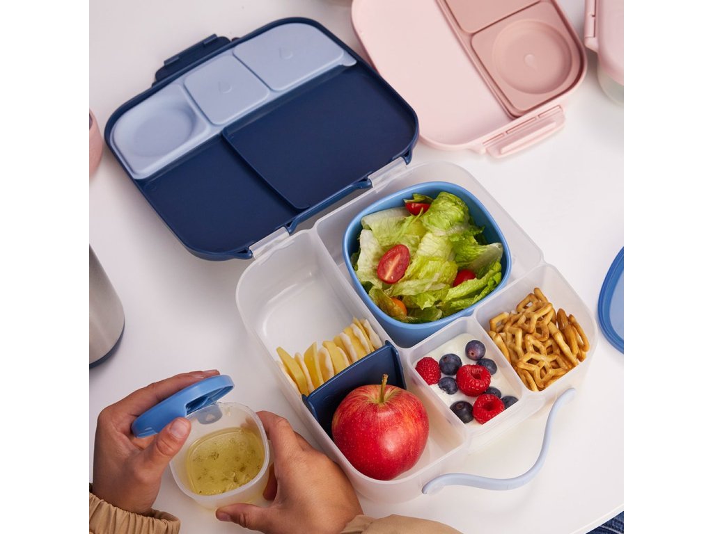 Krabička na svačinu, oběd nebo celodenní výlet, do které se vejde úplně všechno! Děti si během dne rády vybírají z dobrot, které jim připravíte. A tak b.box navrhl variabilní lunchbox, do kterého zabalíte nespočet různých druhů svačinek.