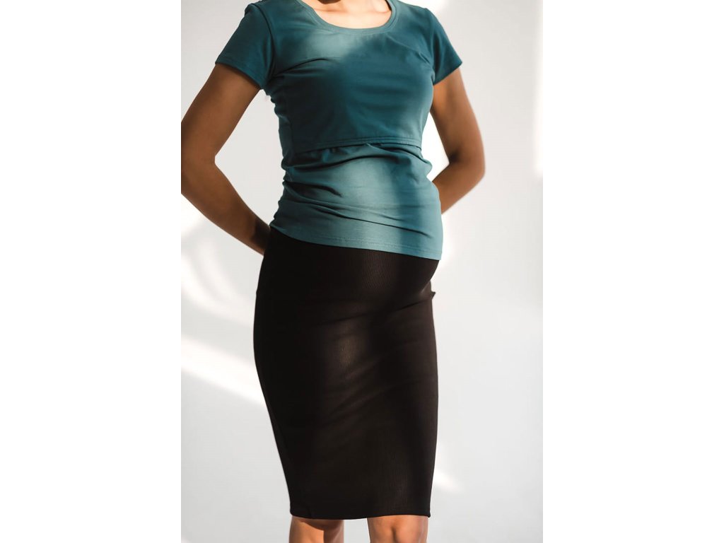 Správny strih, ktorý zakryje drobné nedostatky postavy, ktorá sa ešte nespamätala z tehotenstva a dostatočne dlhý, aby zakryl chrbát. Elastická látka pojme aj tehotenské bruško.