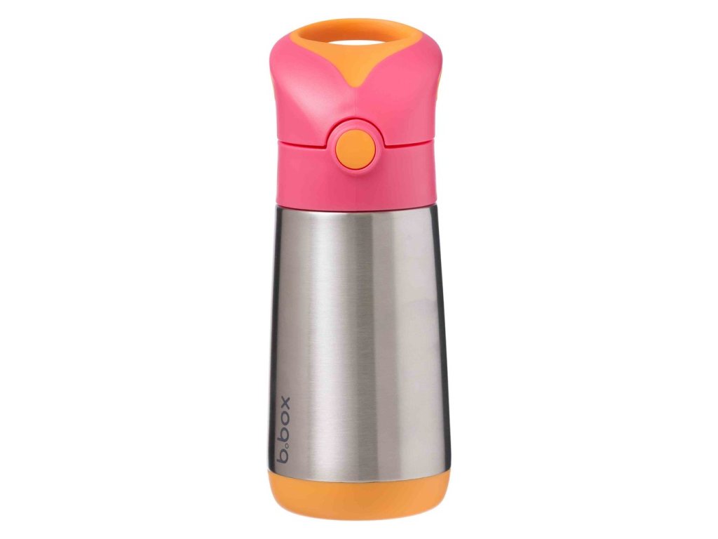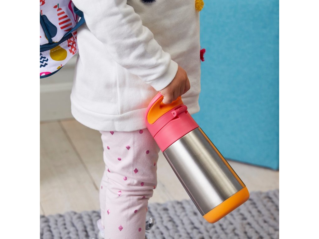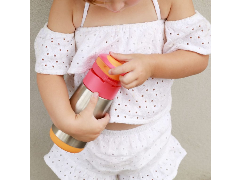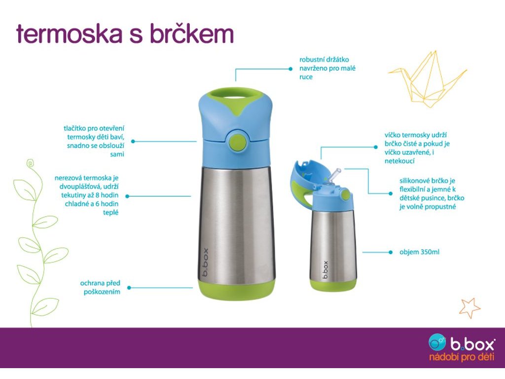 Dvouplášťová termoska z nerezové oceli udrží tekutiny studené až 8 hodin a teplé až 6 hodin. Silikonové brčko dovolí vypít z termosky i tu poslední kapku a víčko má držátko pro snadné nošení nebo zavěšení na batoh, kočárek apod. Termoska se po snadném zmáčknutí "tlačítka" lehce otevře.